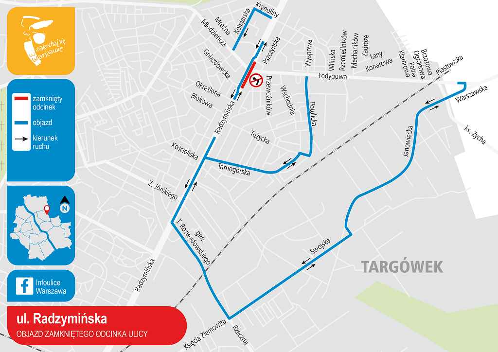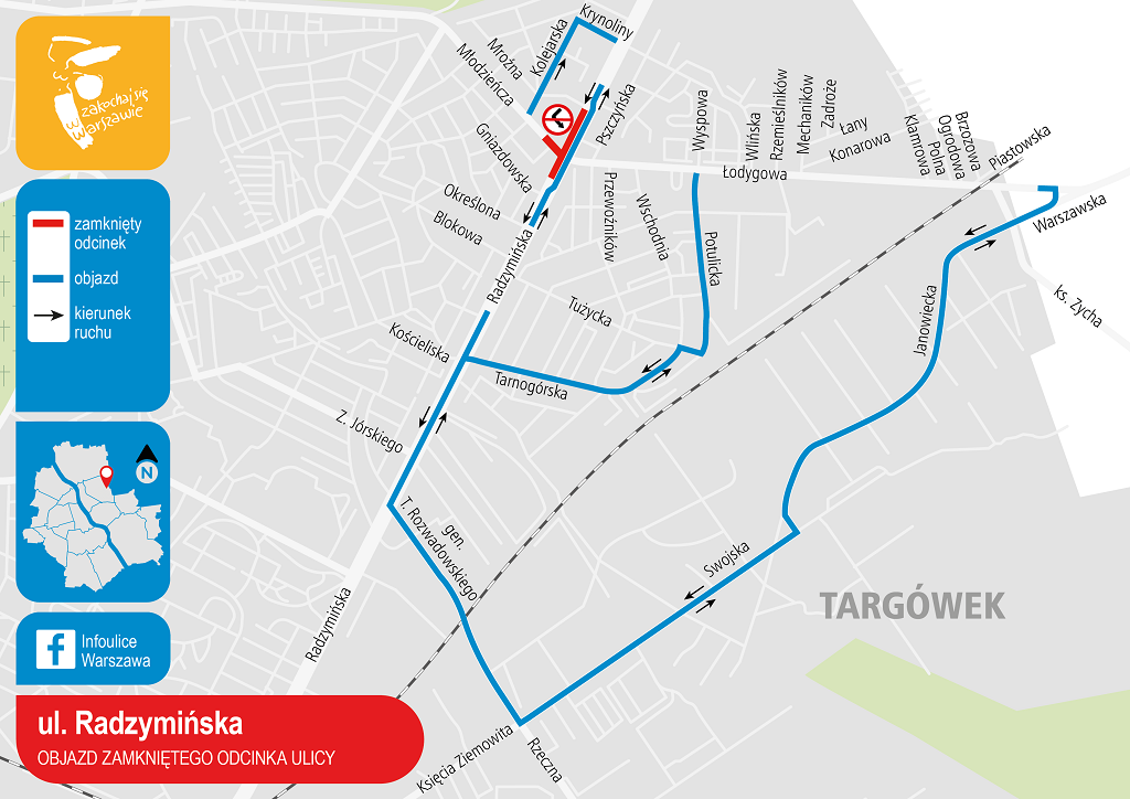 W pierwszym etapie prac, od wtorku, 30 kwietnia, od godz. 22.00 do czwartku, 2 maja do godz. 21.00zamknięta dla ruchu będzie wschodnia jezdnia ul. Radzymińskiej. Ruch w obydwu kierunkach będzie odbywał się na drugiej jezdni. Kierowcy jadący w kierunku Marek przejadą na zachodnią jezdnia przez przewiązkę na wysokości ul. Gniazdowskiej, a na właściwą jezdnię wrócą przy ul. Mroźnej. Ulica Łodygowa nie będzie miała połączenia z ul. Radzymińską, objazd zostanie poprowadzony ulicami gen. T. Rozwadowskiego ? Księcia Ziemowita ? Swojska ? Janowiecka lub Tarnogórska ? Tużycka ? Potulicka. Jadący ul. Młodzieńczą będą mogli dojechać do skrzyżowania z ul. Radzymińską, ale tutaj będą musieli skręcić w prawo lub lewo. Z kolei jadący ul. Radzymińską od strony Pragi nie będą mogli skręcić w lewo w ul. Młodzieńczą ? będą musieli pojechać prosto i skręcić w ul. Krynoliny i ul. Kolejarską wrócić do Młodzieńczej.