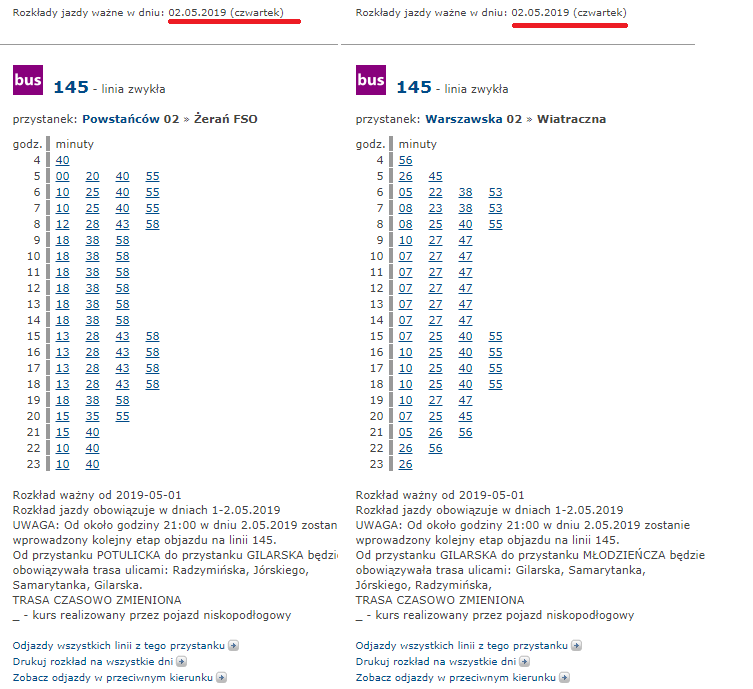 W związku z remontem nawierzchni skrzyżowania ul. Radzymińskiej i ul. Młodzieńczej od dnia 2.05.2019 r. od około godz. 21:00 do dnia 5.05.2019 r. do około godz. 4:00wprowadzone zostaną następujące zmiany tras linii 145, 512 i 527 w obu kierunkach: