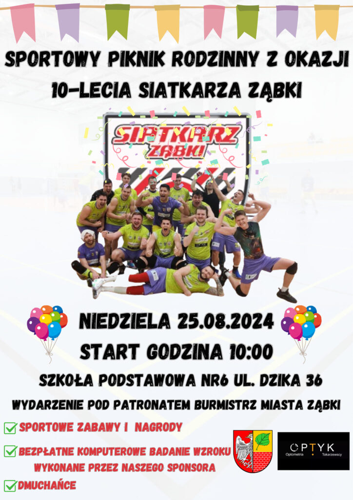Już 25 sierpnia 2024 roku mieszkańcy Ząbek będą mieli wyjątkową okazję do wspólnego świętowania 10-lecia Klubu Sportowego Siatkarz Ząbki. Pod patronatem Burmistrza Miasta Ząbki odbędzie się sportowy piknik rodzinny.  To będzie dzień pełen sportu, zabawy i niespodzianek, na który zaproszeni są wszyscy, zarówno mali, jak i duzi!