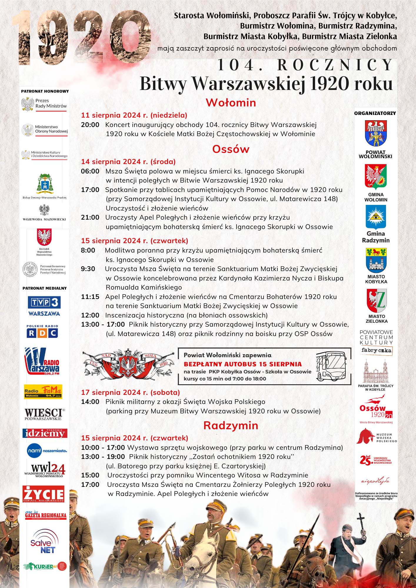 – Bitwa Warszawska była jednym z najważniejszych wydarzeń w historii Polski, decydującym o naszej niepodległości. Wspólnie z burmistrzami Wołomina, Radzymina, Kobyłki i Zielonki oraz pozostałych gmin z terenu powiatu wołomińskiego, serdecznie zapraszam na tegoroczne uroczystości, które odbędą się m.in. w Ossowie, Radzyminie i Wołominie, a których kulminacyjnym momentem będzie inscenizacja historyczna na błoniach ossowskich. Wspólnie uczcijmy pamięć bohaterów, którzy walczyli o wolność naszej Ojczyzny i całej Europy – mówi Starosta Arkadiusz Werelich.