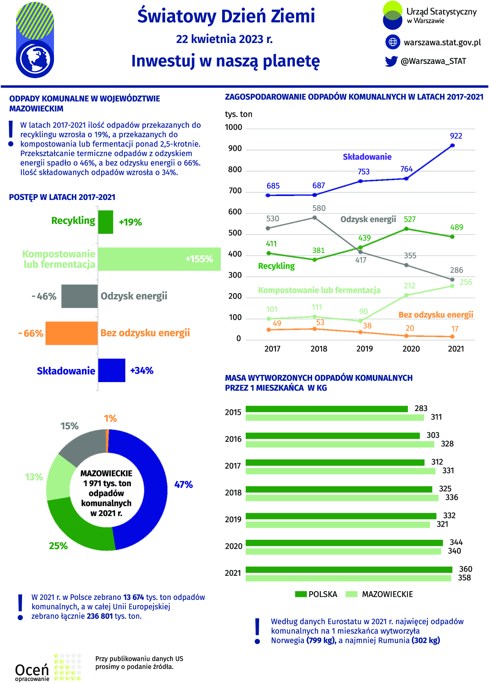 Ilość odpadów wytworzonych przez 1 mieszkańca województwa mazowieckiego wzrosła z 311 kg w 2015 r. do 358 kg w 2021 r. (w Polsce z 283 kg do 360 kg). Jednocześnie rosła też ilość odpadów przekazanych do recyklingu (o 19% w porównaniu z 2017 r.) oraz kompostowania lub fermentacji (o 155%) – tak wynika ze statystyk, które z okazji Światowego Dnia Ziemi przygotował Urząd Statystyczny w Warszawie.