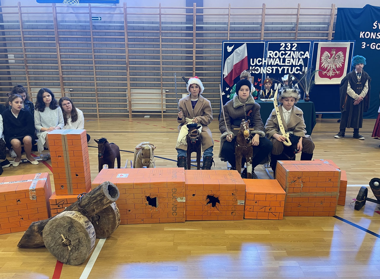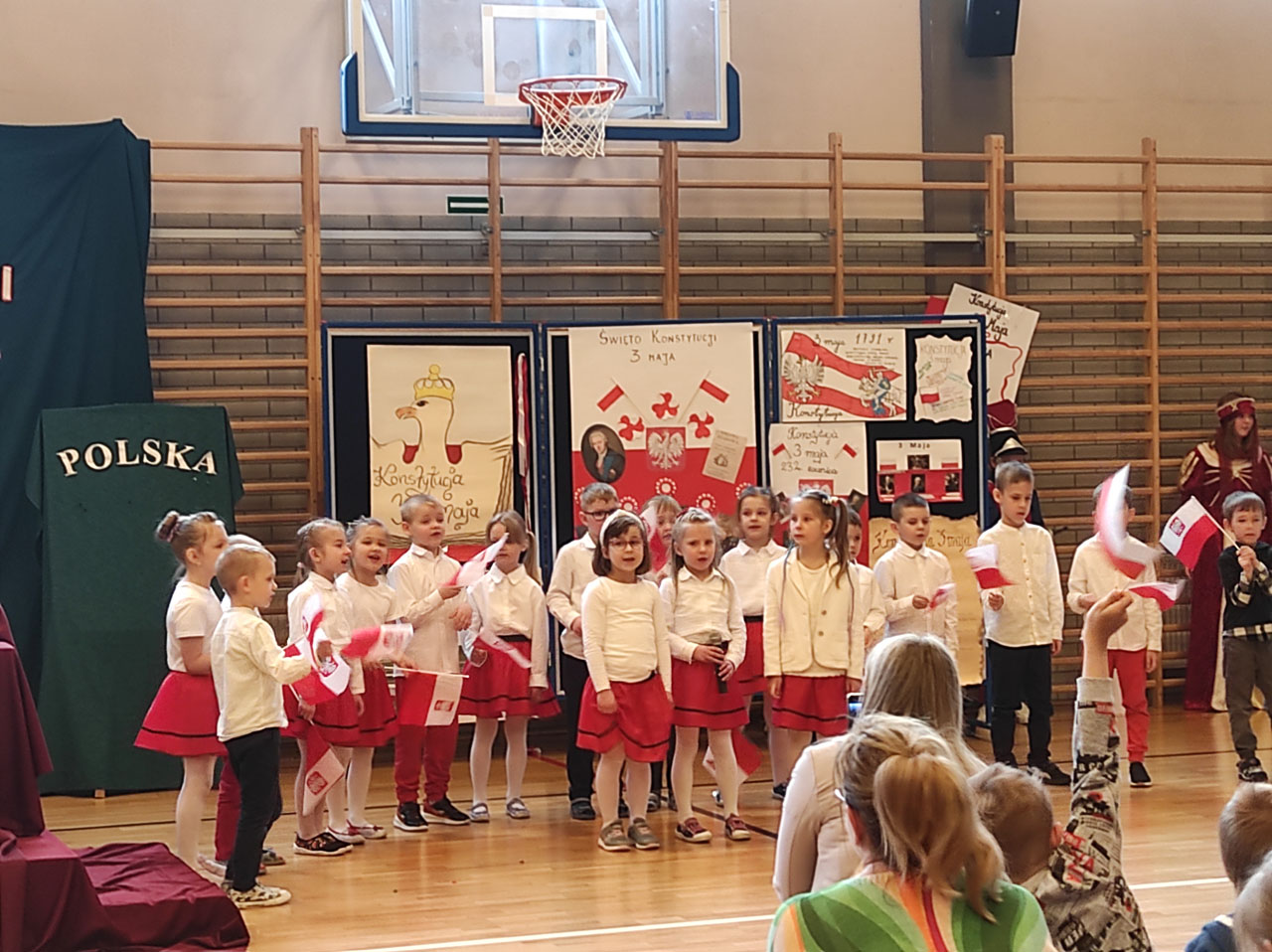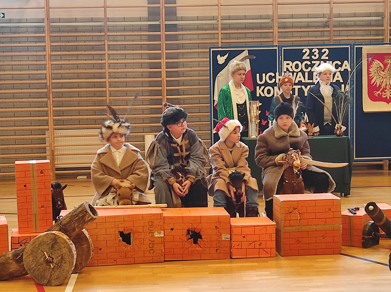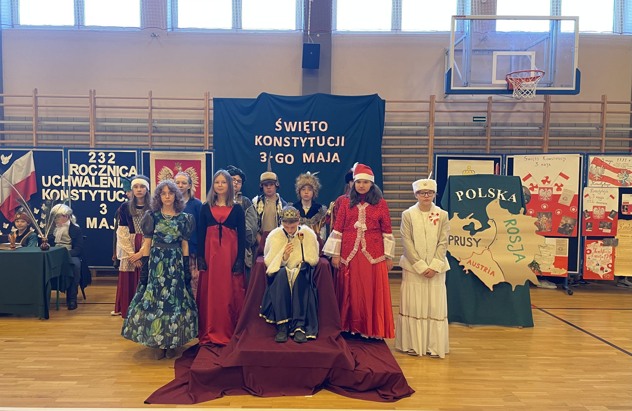 Patriotycznie i uroczyście – tymi słowami można opisać akademię z okazji 232. rocznicy uchwalenia Konstytucji 3 Maja przygotowaną w ramach projektu historycznego przez uczniów klasy szóstej pod kierunkiem nauczyciela historii p. Zbigniewa Wilczyńskiego. Złożyły się na nią wiersze, piosenki oraz teksty narracyjne, przybliżające czasy króla Stanisława Augusta, Sejmu Wielkiego i uchwalenia Konstytucji 3 Maja.