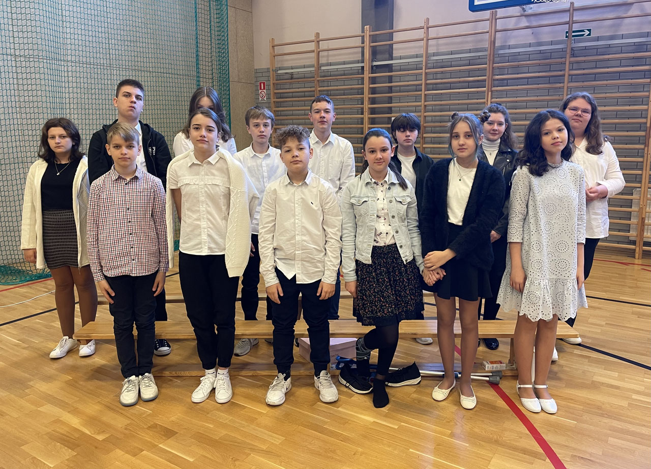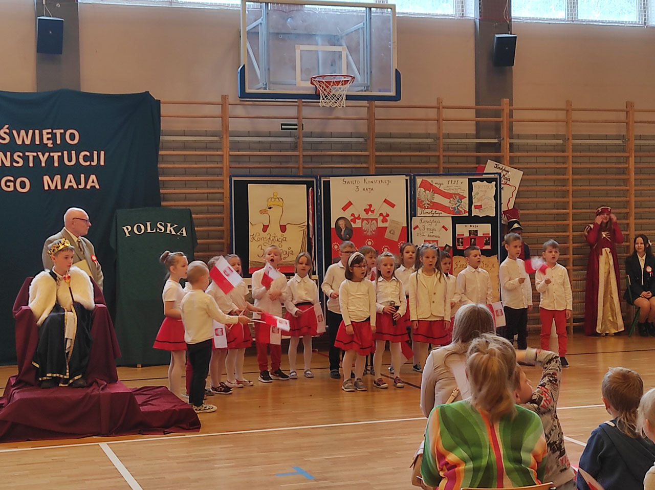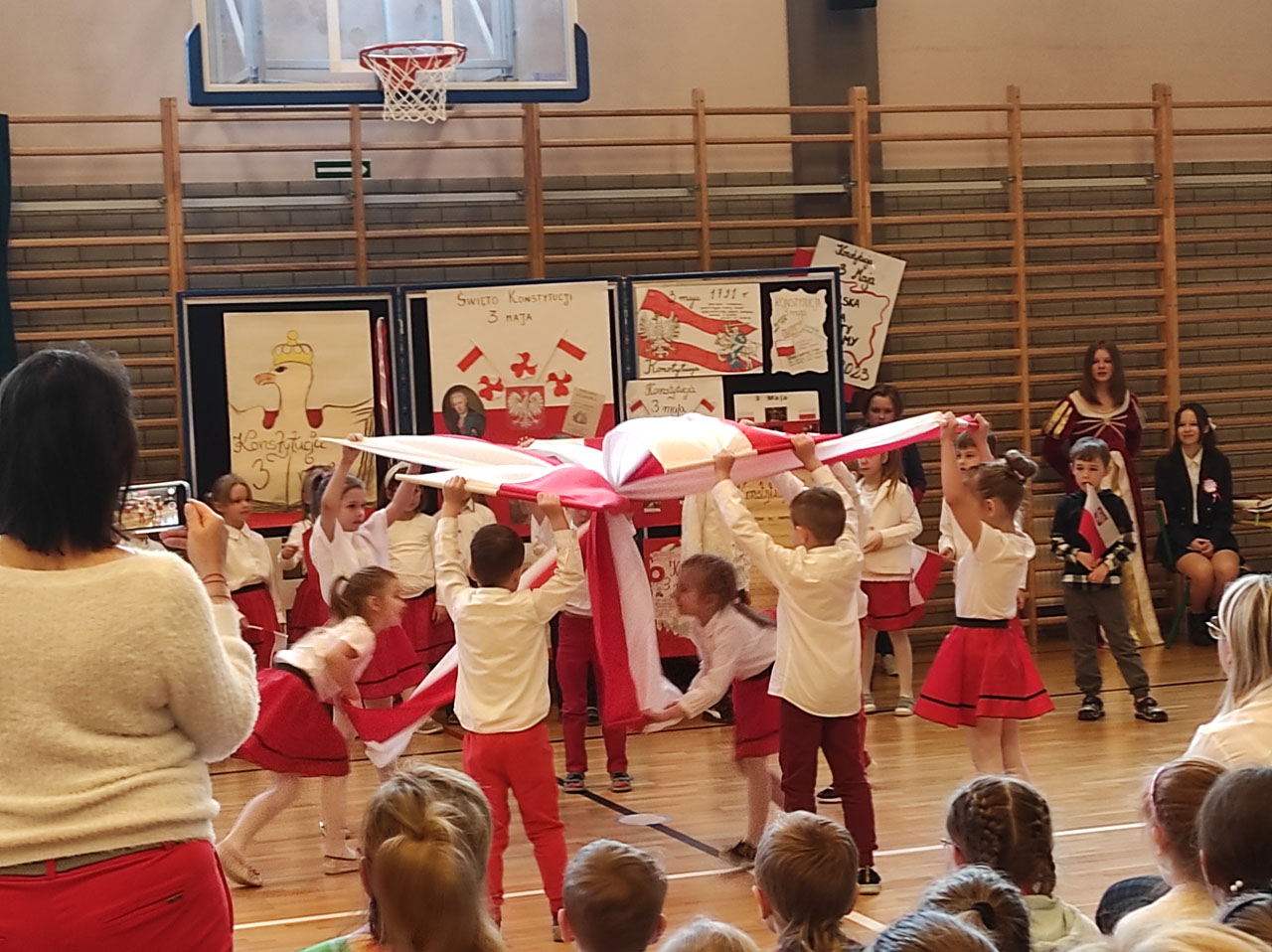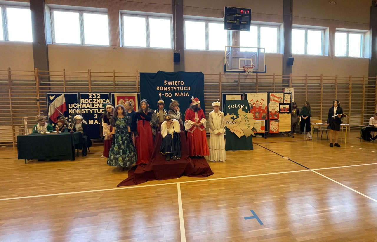 Patriotycznie i uroczyście – tymi słowami można opisać akademię z okazji 232. rocznicy uchwalenia Konstytucji 3 Maja przygotowaną w ramach projektu historycznego przez uczniów klasy szóstej pod kierunkiem nauczyciela historii p. Zbigniewa Wilczyńskiego. Złożyły się na nią wiersze, piosenki oraz teksty narracyjne, przybliżające czasy króla Stanisława Augusta, Sejmu Wielkiego i uchwalenia Konstytucji 3 Maja.