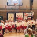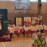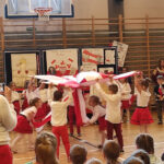Następnie, w nawiązaniu do współczesności, na scenie pojawiła się grupa najmłodszych artystów z oddziału przedszkolnego, którzy żywiołowo zatańczyli „Moją Maryneczke”, wykonali taniec z polską flagą i zaśpiewali piosenkę „Konstytucja 3 Maja”.