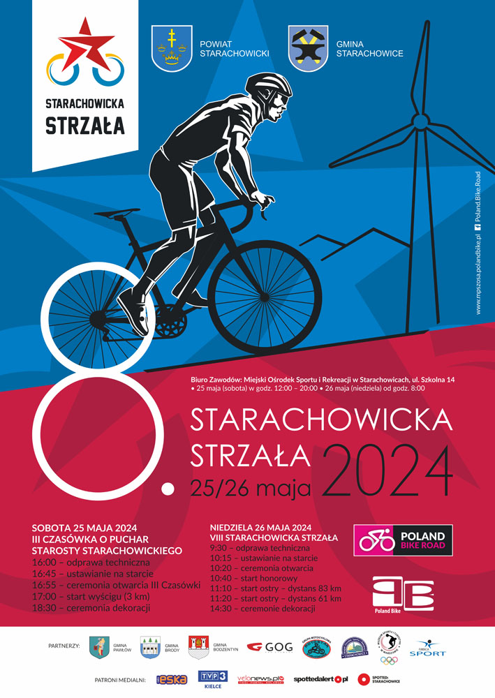 Zbliża się kultowa kolarska impreza! W niedzielę 26 maja w Starachowicach odbędzie się VIII Starachowicka Strzała 2024, wyścigi na rowerach szosowych na fenomenalnej, pofałdowanej trasie. Kolarskie Miasteczko z Biurem Zawodów, startem i metą wyścigów, organizowanych przez Poland Bike, znajdą się przy Miejskim Ośrodku Sportu i Rekreacji w Starachowicach. Do Starachowic i Powiatu Starachowickiego przyjadą kolarze z całej Polski!