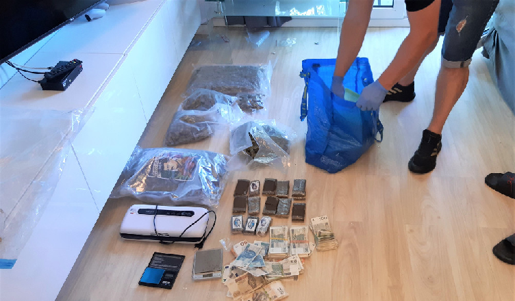 Część z nich, ponad 12 kilogramów środków odurzających, wagę służącą do porcjowania narkotyków oraz gotówkę w kwocie 52 000 złotych policjanci znaleźli w wynajmowanym krótkoterminowo mieszkaniu zajmowanym przez pierwszego z zatrzymanych mężczyzn na warszawskiej Woli. Policjanci znaleźli je w szafie w sypialni, w której spała partnerka 27-latka i ich dziecko. Po wylegitymowaniu 27-latka okazało się, że jest poszukiwany między innymi listem gończym przez sądy w Płocku i w Pruszkowie do odbycia łącznej kary pozbawienia wolności w wysokości 2 lat i 4 miesięcy. Mężczyzna co kilka tygodni wraz z rodziną celowo zmieniał miejsca zamieszkania, aby utrudnić policjantom jego „namierzenie” i zatrzymanie. Zabiegi te okazały się bezskuteczne.