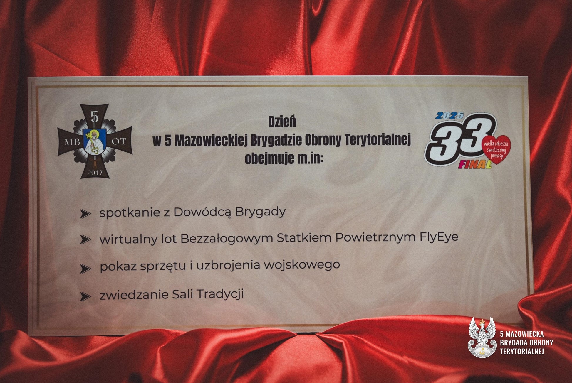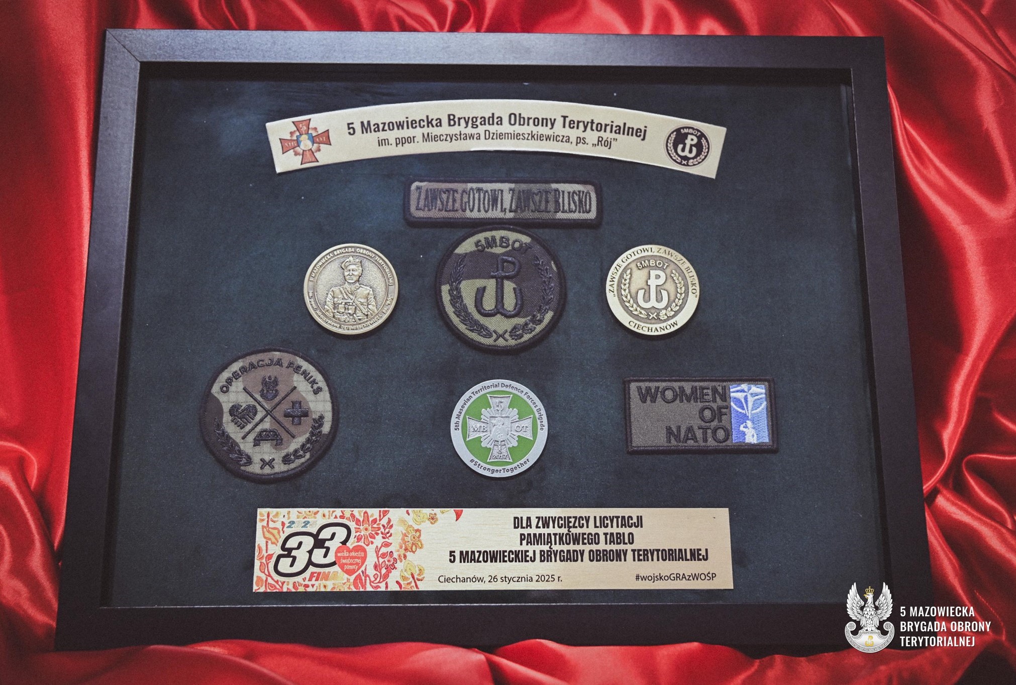 Podobnie jak w roku ubiegłym 5 Mazowiecka Brygada włącza się we wspólne granie z Wielką Orkiestrą Świątecznej Pomocy – na licytację podczas 33. Finału WOŚP, dokłada swoją cegiełkę i przekazuje wyjątkowe przedmioty – pamiątkowe tablo 5 MBOT i voucher „Wejdź na pokład Mazowieckiej Piątki”