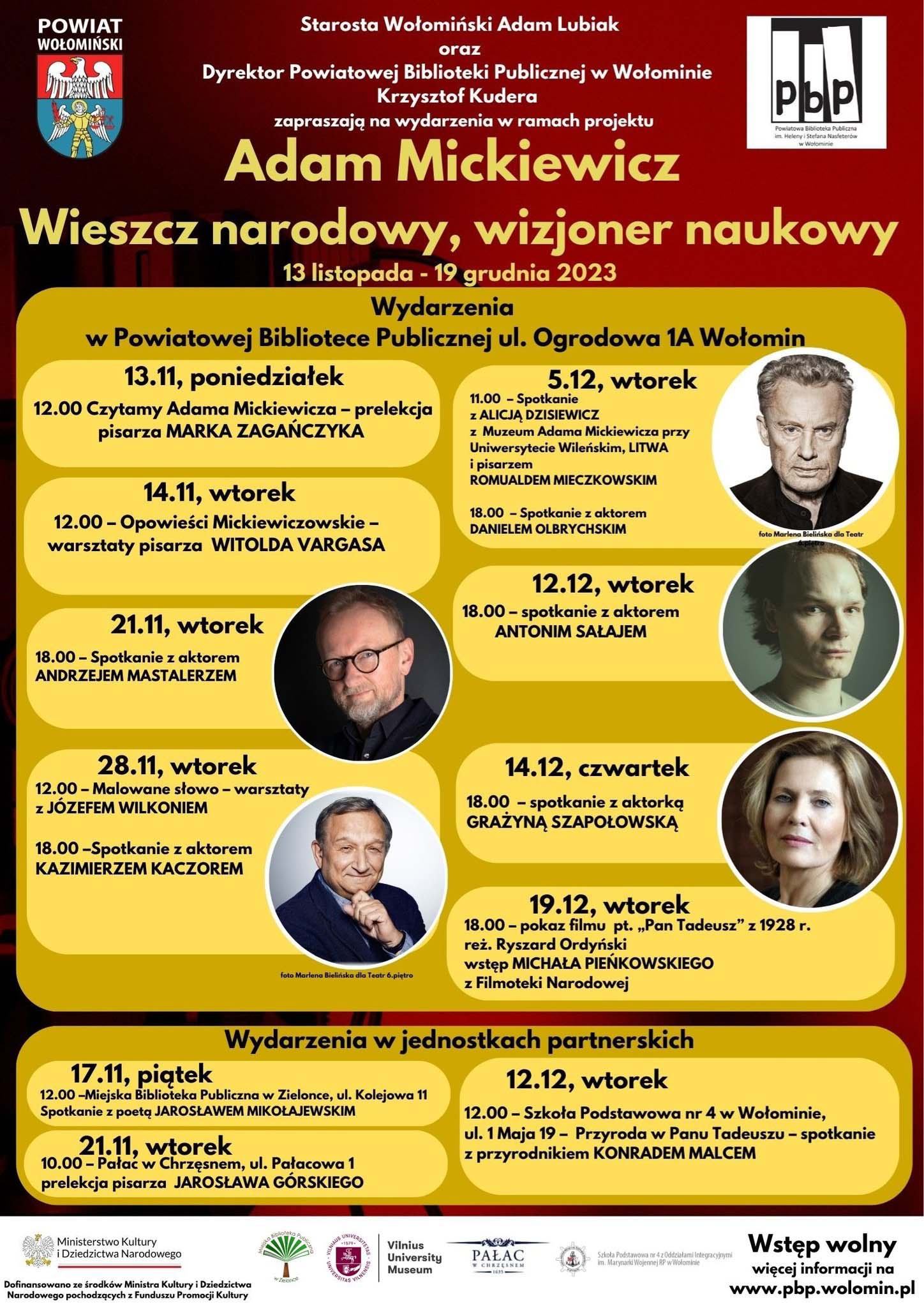 14.12 czwartek, Powiatowa Biblioteka Publiczna im. Heleny i Stefana Nasfeterów w Wołominie18.00 – Mistrzowskie czytanie Pana Tadeusza – spotkanie z aktorką GRAŻYNĄ SZAPOŁOWSKĄ