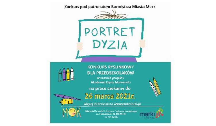 Zaczynamy od ustalenia, jak Dyzio wygląda i ogłaszamy konkurs plastyczny zatytułowany ?Portret Dyzia?. Należy narysować Dyzia, bohatera wiersza Juliana Tuwima ?Dyzio Marzyciel? i patrona naszej Akademii. Skan lub fotografię rysunku prześlijcie na adres o.sarnowska@mokmarki.pl do 26 marca. Zapraszamy przedszkolaki od lat 3. Przewidujemy atrakcyjne nagrody. Szczegóły i regulamin konkursu znajdziecie na stronie www.wirtualnymok.pl – zachęca MOK