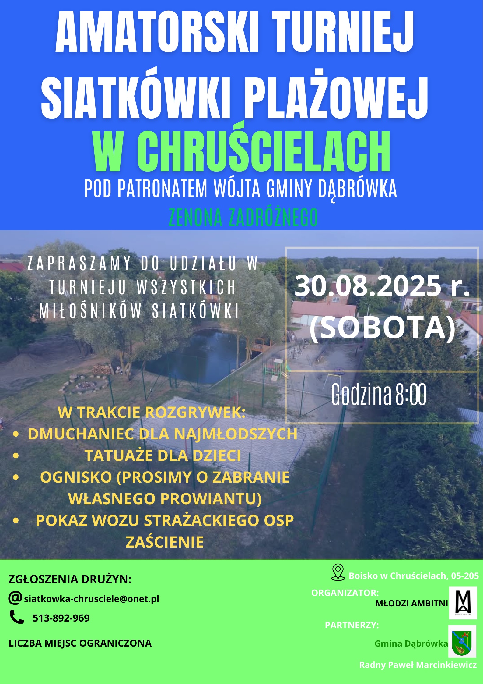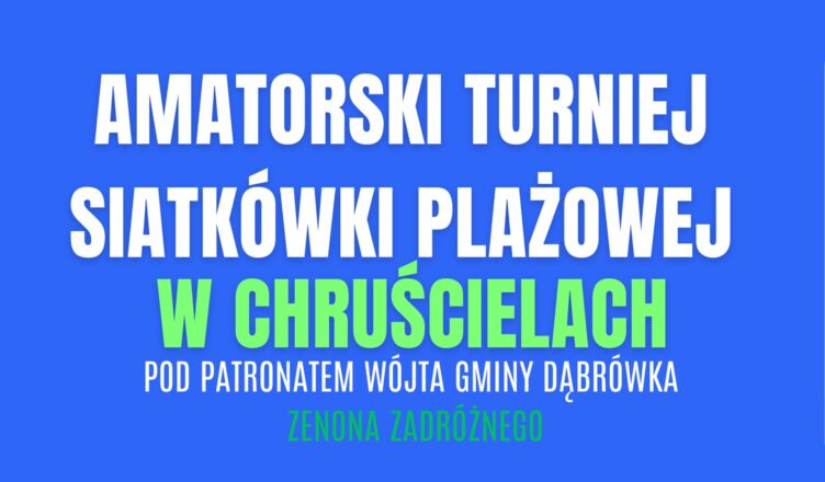 Zapraszamy wszystkich mieszkańców Gminy Dąbrówka, amatorów i pasjonatów siatkówki plażowej na Amatorski Turniej Siatkówki Plażowej w Chruścielach pod patronatem Wójta Gminy Dąbrówka Zenona Zadróżnego. Rozgrywki odbędą się 30 sierpnia 2025 r. od godz. 8.00 na boisku w Chruścielach. – zachęca Urząd Gminy