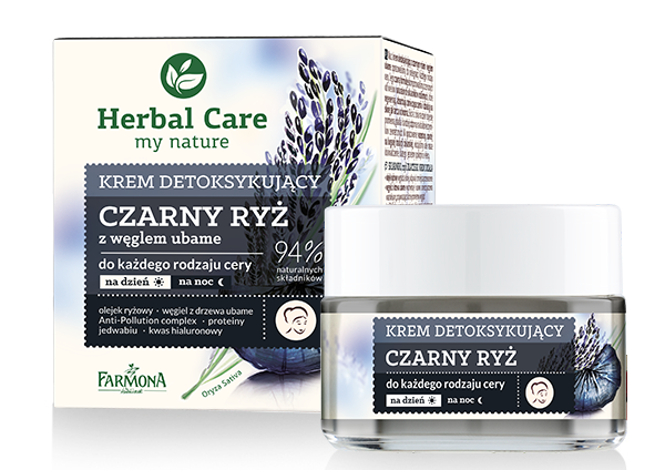 Krem detoksykujący z czarnym ryżem i węglem ubame powstał z myślą o pielęgnacji każdego rodzaju  cery. Jego czarną formułę specjaliści marki Herbal Care skomponowali z cenionych od wieków naturalnych składników roślinnych, które regenerują cerę oraz absorbują zanieczyszczenia i działają jak tarcza ochronna.  Zawarty w kremie olejek ryżowy wygładza skórę, odżywia ją i zmniejsza jej przesuszenie. Węgiel z drzewa ubame wychwytuje i usuwa zanieczyszczenia oraz toksyny, przywracając cerze promienny wygląd. Jego działanie wspiera Anti-Pollution complex, który zabezpiecza skórę przed uszkodzeniem wywołanym przez toksyczne substancje, takie jak metale ciężkie, gazy i promieniowanie UV. W kremie znajdziemy także proteiny jedwabiu tworzące na powierzchni skóry film ochronny, sprawiając że staje się ona przyjemna w dotyku oraz kwas hialuronowy, który zapewnia silne, natychmiastowe i długotrwałe nawilżenie.