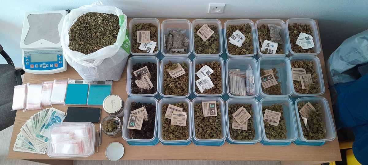 Podczas przeszukania pomieszczeń, należących do 29-latka, policjanci zabezpieczyli ponad 1,5 kg marihuany, a także przedmioty służące do porcjowania narkotyków. W wyniku dalszych czynności policjanci zlikwidowali plantację 56 krzewów konopi oraz skonfiskowali sprzęt, wykorzystywany do ich uprawy. Dodatkowo funkcjonariusze zabezpieczyli gotówkę w wysokości blisko 5 tys. zł, mogącą pochodzić z procederu narkotykowego.