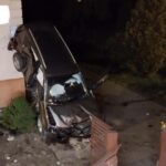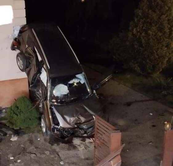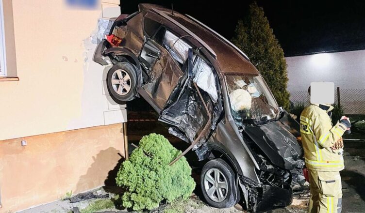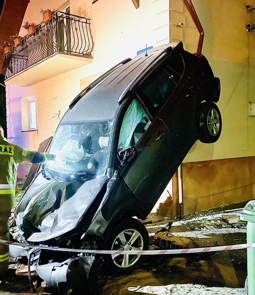 SUV zjechał na lewą stronę uderzył w ogrodzenie posesji, wyrwał przęsło razem z betonowym fundamentem i zatrzymał się dopiero pionowo na elewacji budynku mieszkalnego. Lecące w powietrzu elementy parkanu zbiły okno i wpadły do domowego salonu, w którym siedział jeden z domowników.