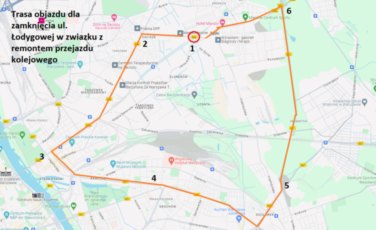 Zalecany objazd poprowadzi ulicami: Łodygową, Radzymińską, aleją „Solidarności”, Targową, Grochowską, Marsa i Żołnierską. Do Ząbek będzie można dojechać ulicami Swojską i Janowiecką lub Bystrą i Stefana Batorego.