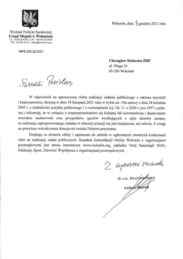 Od kilku lat Harcerze z Hufca Wołomin w grudniu udają się w Tatry by przywieść do naszego miasta ?Betlejemskie Światełko Pokoju? . Kolejni Burmistrzowie niezależnie od opcji politycznej wspierali finansowo nas w tym zadaniu. Rok 2021 był dla na wszystkich bardzo ciężki. Szalejąca pandemia o mały włos uniemożliwiła harcerską pracę w sposób jaki to robimy od 50 lat. Ale mimo to nie poddaliśmy się ! Wołomińscy instruktorzy prowadzili zajęcia , zbiórki , biwaki ? systematycznie i z zachowaniem wszelkich możliwych reżimów sanitarnych. W innych jednostkach Chorągwi Stołecznej dramatycznie zmalała liczba Harcerzy, zaprzestano organizacji wypoczynku letniego ? ale nie w Wołominie! W ubiegłym roku zorganizowaliśmy i przeprowadziliśmy bez zakłóceń (bez żadnych zakażeń i bez żadnej kwarantanny) akcję letnią jako jeden z nielicznych stołecznych hufców a wypoczywało na naszych obozach ponad 300 wołomińskich harcerzy i zuchów. Przez dwa lata szalejącej pandemii liczebność Harcerzy znacznie wzrosła. Stanowi wręcz fenomen i jest wyrazem uznania i zaufania rodziców do naszej pracy w trudnym covidowym czasie !