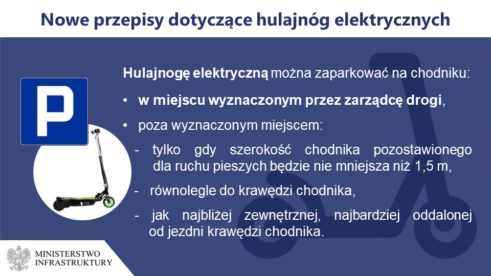 Kierujący hulajnogą elektryczną musi korzystać z dróg rowerowych lub pasa ruchu dla rowerów. W przypadku ich braku – może korzystać z jezdni, gdzie prędkość nie przekracza 30 km/h. Wyjątkowo dozwolone jest poruszanie się chodnikiem, jeśli brakuje innych opcji, przy czym:
