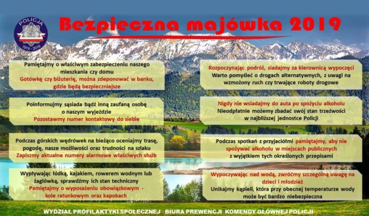 Podczas całej ?majówki? nad naszym bezpieczeństwem będą czuwać policjanci, jednak bezpieczny wypoczynek zależy w dużej mierze od nas samych. Nic nie zwalnia nas od myślenia, a wybrana forma wypoczynku powinna odbywać się zgodnie z obowiązującymi przepisami. Pamiętajmy o bezpieczeństwie swoim i swoich najbliższych!