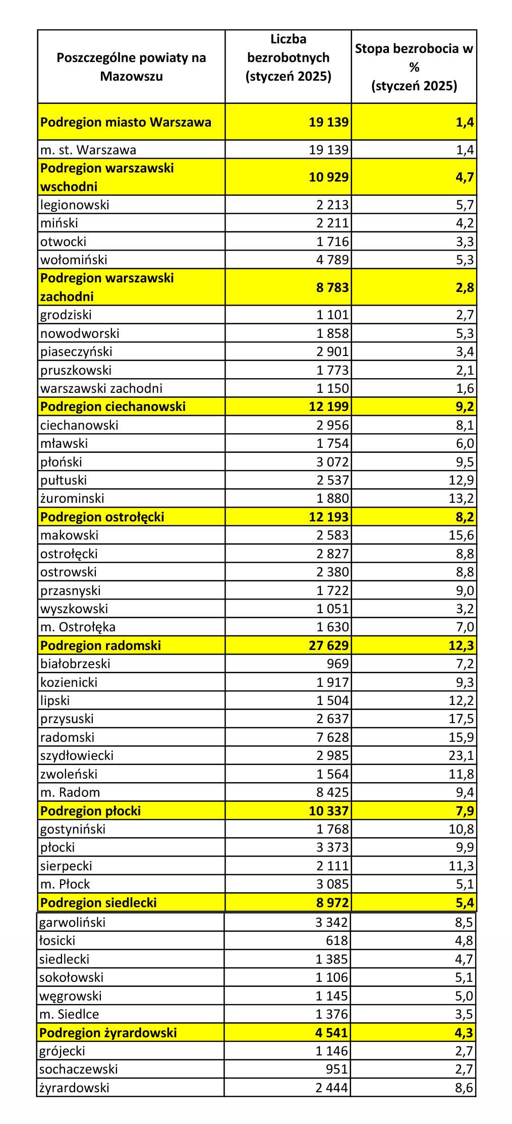 Na Mazowszu występuje duże terytorialne zróżnicowanie stopy bezrobocia. W porównaniu do grudnia 2024 spadła ona w 6 powiatach województwa mazowieckiego, w 23 z nich wzrosła, a w 13 pozostaje na tym samy poziomie.