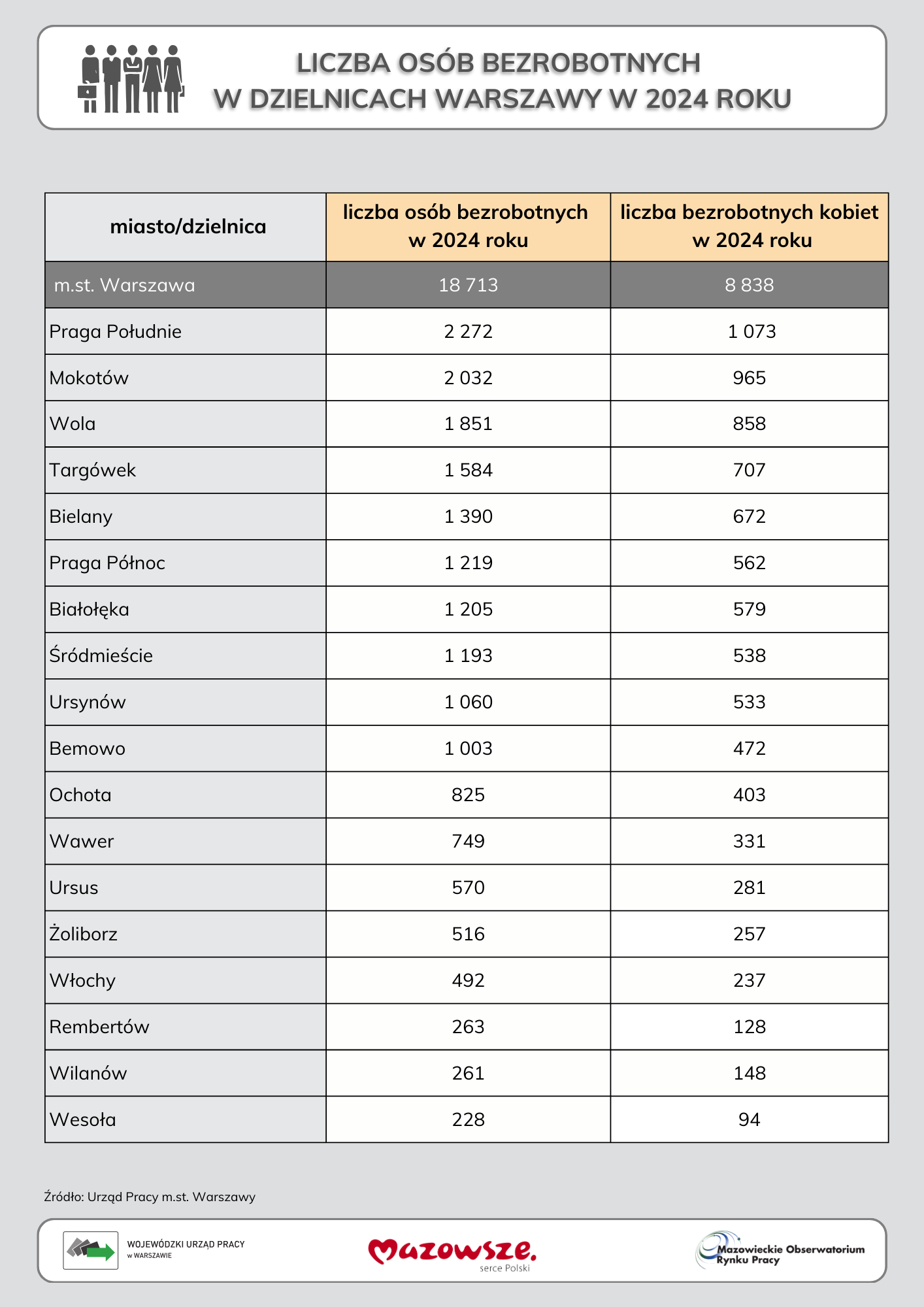 Jeśli chodzi o poszczególne dzielnice, to najwięcej bezrobotnych zarejestrowanych jest na Pradze Południe (12,1% ogółu bezrobotnych w stolicy), a najmniej w Wesołej (1,2% wszystkich zarejestrowanych bezrobotnych w Warszawie).