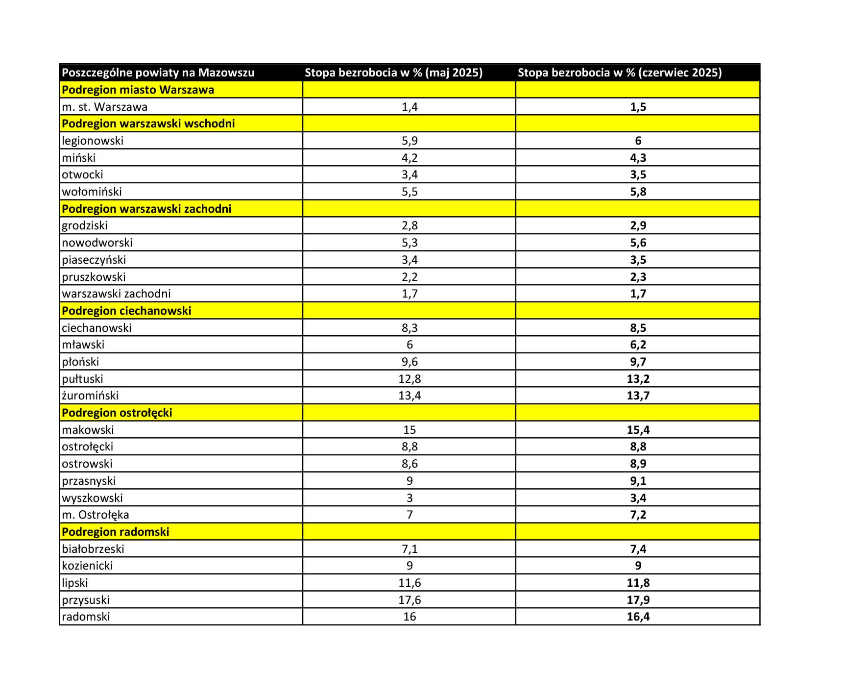 Na Mazowszu występuje duże terytorialne zróżnicowanie stopy bezrobocia. Tak jak w poprzednich miesiącach najmniejsze bezrobocie mamy w Warszawie. Na koniec czerwca w stolicy zarejestrowanych było 20 051 osób, czyli o 333 więcej niż w maju. Jest to jednak wzrost niewielki – stopa bezrobocia w stolicy wynosi 1,5% (w maju było to 1,4%).