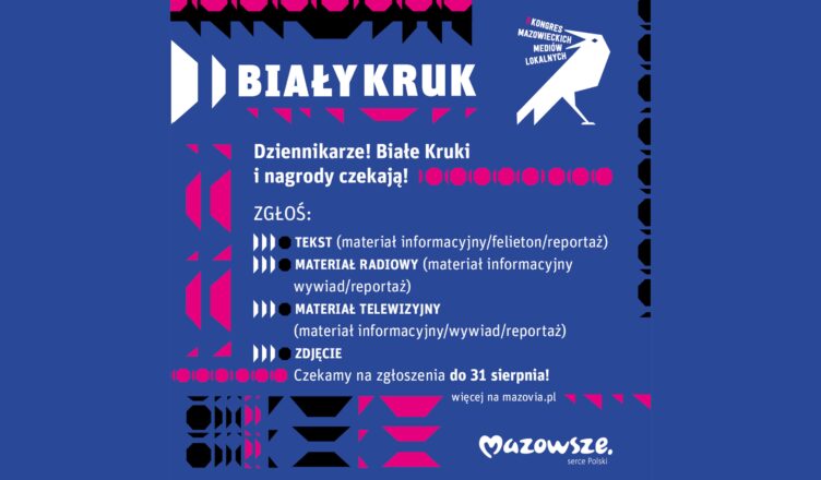 Jesteś dziennikarzem, który pisze o sprawach ważnych dla lokalnych mieszkańców? Umiesz uchwycić piękno Mazowsza na fotografiach? Zgłoś się do drugiej edycji konkursu „Biały Kruk”. Nabór trwa do 31 sierpnia. W tym roku są wyższe nagrody i jest więcej kategorii.