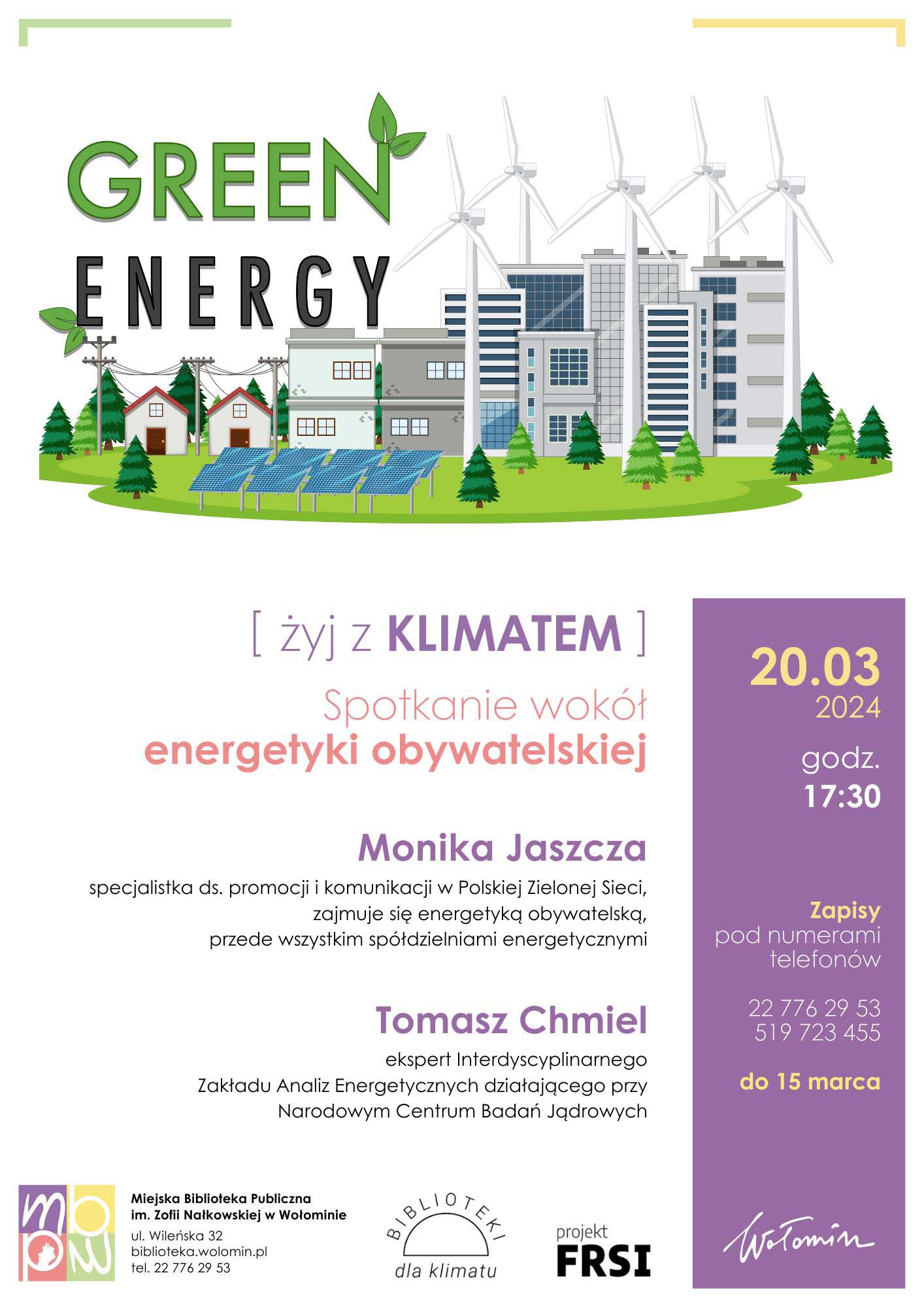 Żyj z klimatem, czyli kolejne z cyklu spotkanie, które odbędzie się w ramach projektu „Biblioteka dla klimatu”. Miejska Biblioteka Publiczna im. Zofii Nałkowskiej w Wołominie zaprasza na spotkanie poświęcone energetyce obywatelskiej. Podczas spotkania poruszony zostanie temat, jak społeczności mogą być bardziej niezależne, oszczędzać pieniądze i ograniczać emisję szkodliwych substancji do atmosfery.