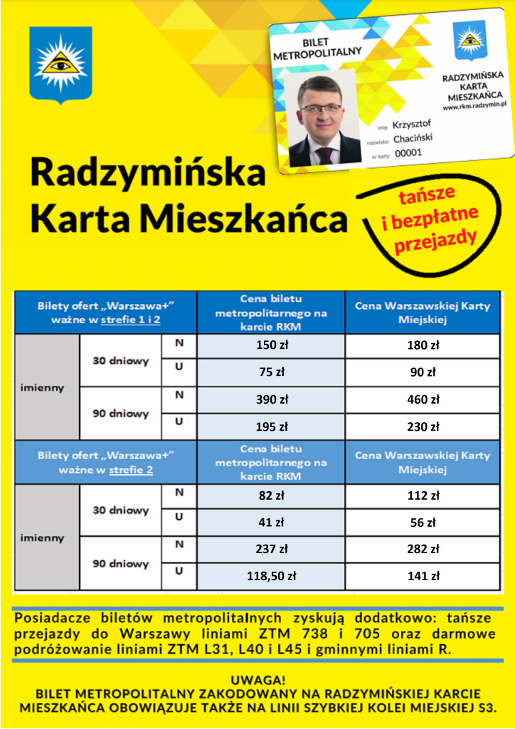 Od 1 stycznia 2024 roku Gmina Radzymin przechodzi na II (wyższy!) poziom dofinansowania dla biletów ZTM w ofercie „Warszawa+” dla posiadaczy ważnej Radzymińskiej Karty Mieszkańca (RKM).