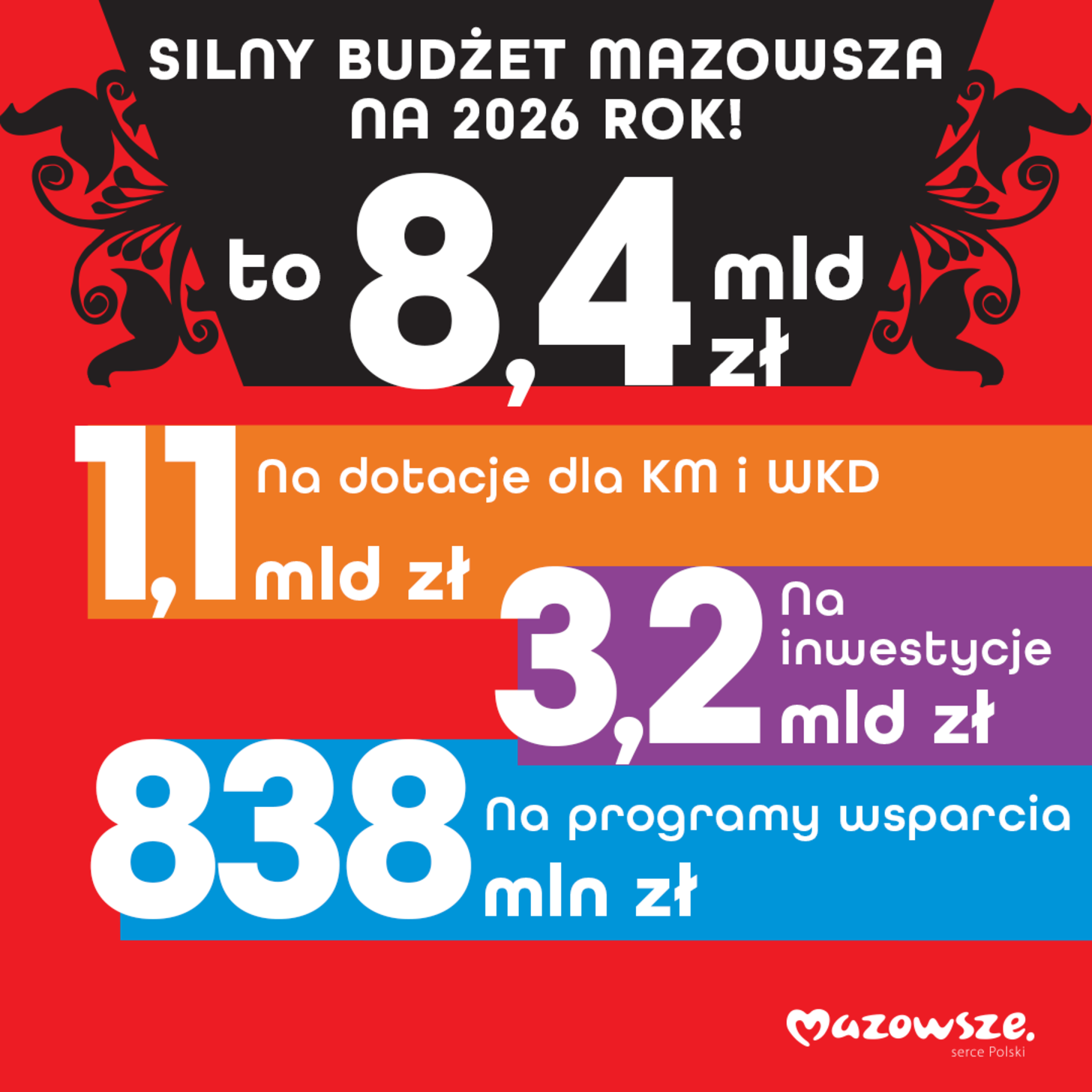 16 grudnia radni województwa mazowieckiego przyjęli budżet na 2026 rok. Wynosi on ponad 8,4 mld zł. Na modernizacje i rozbudowy dróg, szpitali, instytucji kultury czy szkół władze regionu przeznaczą ponad 3,2 mld zł. Ponad 838 mln zł zostanie przekazanych na wsparcie gmin, powiatów i organizacji pozarządowych w ramach programów wsparcia, a 1,1 mld zł na dotacje dla KM i WKD.