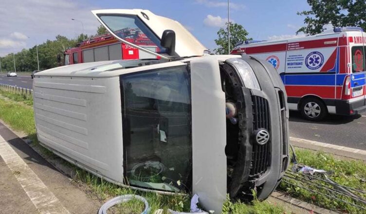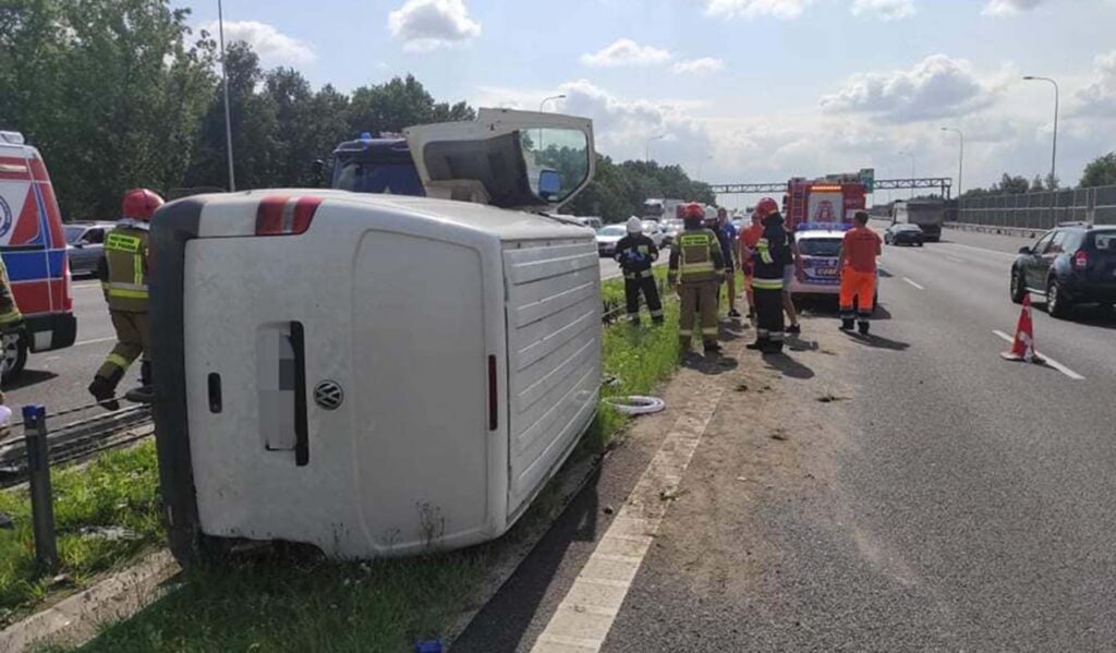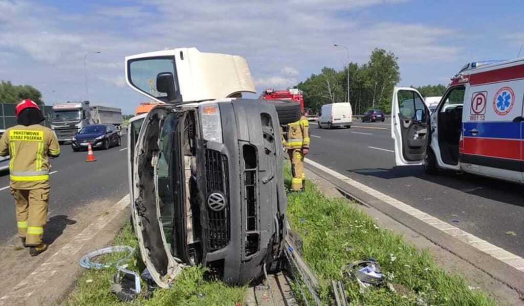 Na trasie S8 bus uderzył w barierki. Wypadek miał miejsce na wysokości Marek w kierunku do Wyszkowa. Bus po zderzeniu wylądował na boku.