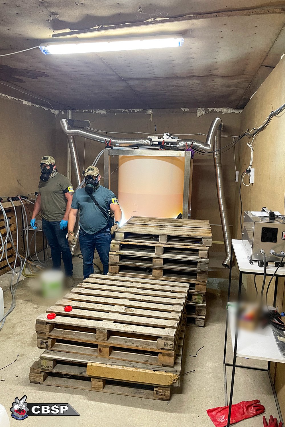 Na podstawie zebranych materiałów policjanci CBŚP, wspierani przez funkcjonariuszy Centralnego Pododdziału Kontrterrorystycznego Policji BOA, przeprowadzili działania w powiecie pruszkowskim. Podczas przeszukania pomieszczeń magazynowych i mieszkalnych ujawniono specjalistyczną aparaturę, urządzenia oraz kompletną linię technologiczną służącą do produkcji narkotyków.