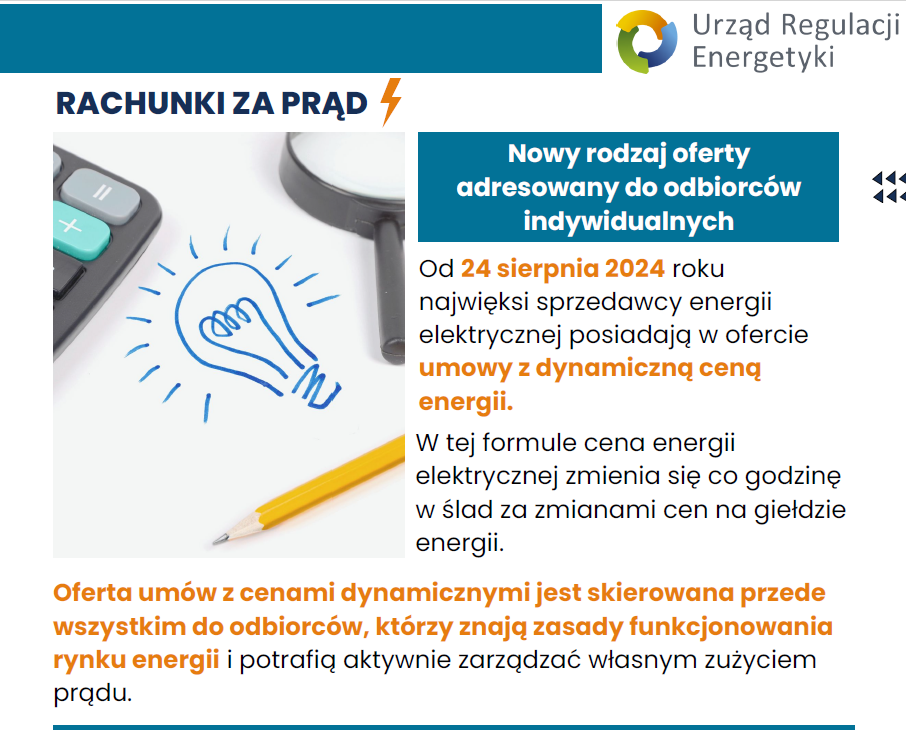 Urząd Regulacji Energetyki zaprasza do zapoznania się z broszurą informacyjną, która w sposób przejrzysty i kompleksowy wyjaśnia zasady działania umowy z ceną dynamiczną.