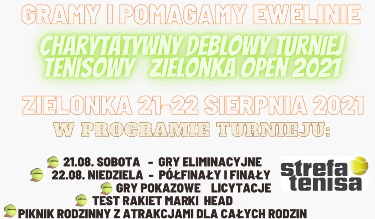 W sobotę i w niedzielę 21 – 22 sierpnia 2021 r. w parku miejskim „Dębinki” w Zielonce odbędzie się charytatywny deblowy turniej tenisowy „Zielonka Open 2021” pod hasłem „Gramy i Pomagamy Ewelinie”