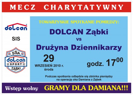 Już w środę, 29 września odbędzie się mecz charytatywny pomiędzy drużyną dziennikarzy a piłkarzami I ligowego klubu Dolcan Ząbki i pracownikami stołecznego dewelopera. Celem spotkania jest zbiórka pieniędzy na operację oka dla Damiana, który stracił wzrok podczas zajęć sportowych. Wstęp na mecz jest bezpłatny.