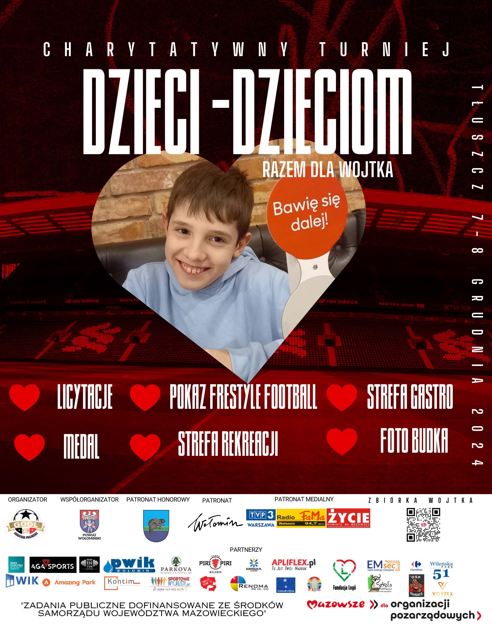 Już 7 i 8 grudnia na hali sportowej Szkoły Podstawowej nr 1 w Tłuszczu (ul. Kościelna 1) odbędzie się IX edycja Charytatywnego Turnieju Piłki Nożnej Dzieci-Dzieciom. W tej edycji gramy i wspieramy 12-letniego Wojtka – mieszkańca gminy Wołomin, który potrzebuje licznych i kosztownych rehabilitacji.