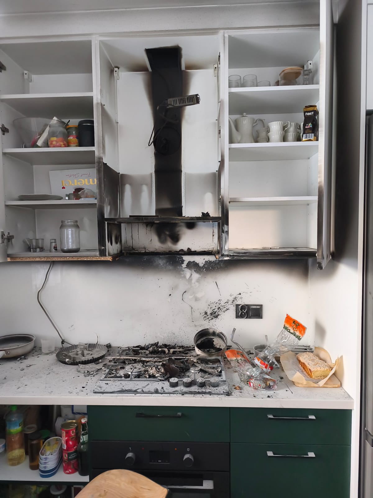 Po przybyciu pierwszych zastępów na miejsce zdarzenia stwierdzono, że pożar powstał w kuchni jednego z mieszkań. Źródłem ognia był garnek z olejem pozostawiony na włączonej kuchence gazowej, co doprowadziło do jego zapalenia. W wyniku zdarzenia doszło do silnego zadymienia pomieszczenia kuchennego oraz nadpalenia elementów zabudowy kuchennej, w szczególności okapu, szafek wiszących oraz powierzchni nad płytą grzewczą. Widoczne były liczne ślady okopcenia ścian, mebli i sprzętów kuchennych, a także uszkodzenia wynikające z działania wysokiej temperatury i produktów spalania.