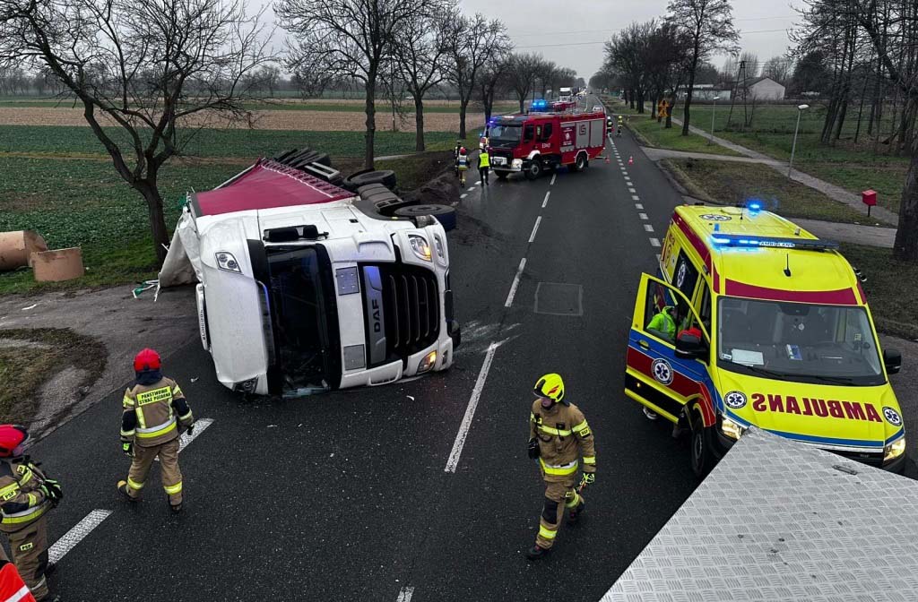 Strażacy z Komendy Powiatowej Straży Pożarnej w Sochaczewie po dojeździe na miejsce wypadku zastali zestaw ciężarowy leżący w przydrożnym rowie. Kierujący wysiadł o własnych siłach, a po przebadaniu przez zespół ratownictwa medycznego pozostał na miejscu zdarzenia.