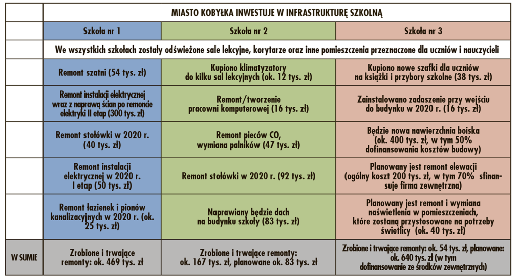 Wiele się dzieje i wiele się jeszcze będzie działo. Przed nami jeszcze naprawa elewacji w Szkole nr 1 i w Szkole nr 3. A co już zostało zrobione? We wszystkich szkołach, podczas wakacji, sukcesywnie odświeżane były sale lekcyjne, korytarze oraz inne pomieszczenia przeznaczone dla uczniów i nauczycieli. W Szkole nr 2 kupiono klimatyzatory do kilku sal lekcyjnych, otwarto pracownię komputerową (koszt ok. 16 000 zł), zrobiony remont pieców CO (wymiana palników) – koszt ok. 47 tys. zł. Będzie również w przyszłości naprawiany dach na budynku szkoły ? koszt ok. 83 tys. zł. Remont dachu będzie zresztą konieczny we wszystkich szkołach, gdyż od wielu lat dachy były tylko doraźnie łatane. Od 2013 roku dyrekcja szkoły nr 3 bezskutecznie występowała o środki na ten cel. W Szkole nr 1 na 1 września będzie wyremontowana szatnia (koszt – 54 tys. zł) oraz instalacja elektryczna wraz z naprawionymi i odświeżonymi ścianami po remoncie elektryki w II etapie (300 tys. zł). Z kolei w Szkole nr 3 od początku roku szkolnego dla uczniów zaczną funkcjonować nowe szafki, przeznaczone na książki i przybory szkolne. W szkole planowany jest jeszcze remont i wymiana naświetlenia w pomieszczeniach, które zostaną przystosowane na potrzeby świetlicy szkolnej (koszt ok. 25 tys. zł), a także nowa nawierzchnia boiska (koszt to ok. 400 tys. zł, w tym dofinansowanie 50% kosztów budowy). Dlatego inwestujemy w jakość bazy szkolnej – przekłada się to bezpośrednio na jakość edukacji, bezpieczeństwo, a często na osiągane przez uczniów wyniki. Dlatego cieszy mnie, że szkoły robią dobry użytek ze środków otrzymywanych z Urzędu Miasta.