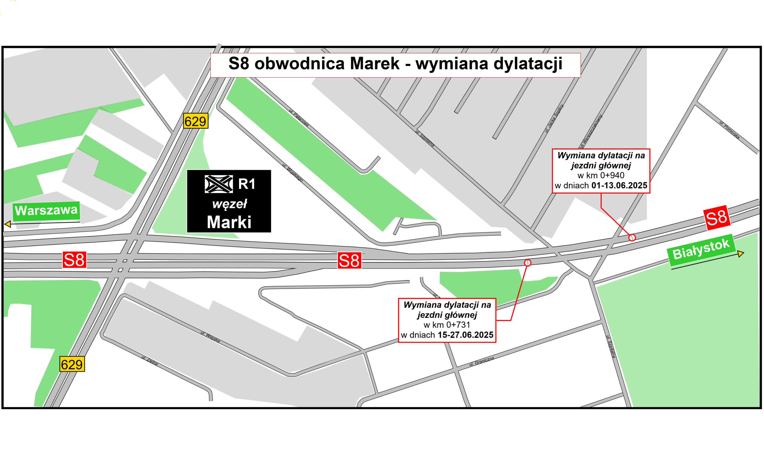 W poniedziałek, 2 czerwca (g.12.00) na S8 obwodnicy Marek (jezdnia w stronę Warszawy, km 0+940) rozpocznie się wprowadzanie zmiany w organizacji ruchu. Powodem jest gwarancyjna wymiana dylatacji pomiędzy węzłami: Zielonka a Marki. Roboty będą prowadzone przy zajętości połowy jezdni.