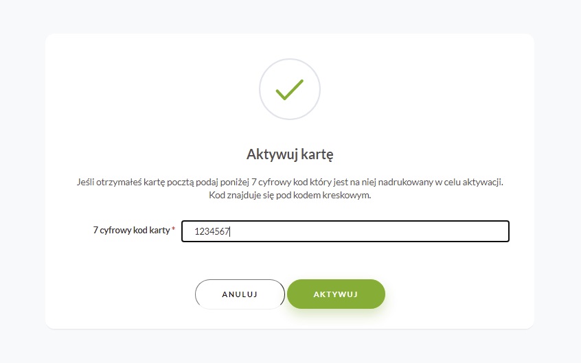 Po kliknięciu w link ?Aktywuj kartę? jesteśmy proszeni o wpisanie numeru 7 cyfrowego karty, który znajduje się na karcie fizycznej pod kodem kreskowym. Po kliknięciu przycisku Aktywuj ? karta będzie już aktywna. W przypadku kart nieletnich dzieci aktywujemy je analogicznie ? znajdziemy je w menu ?Moja rodzina? w zakładce karty