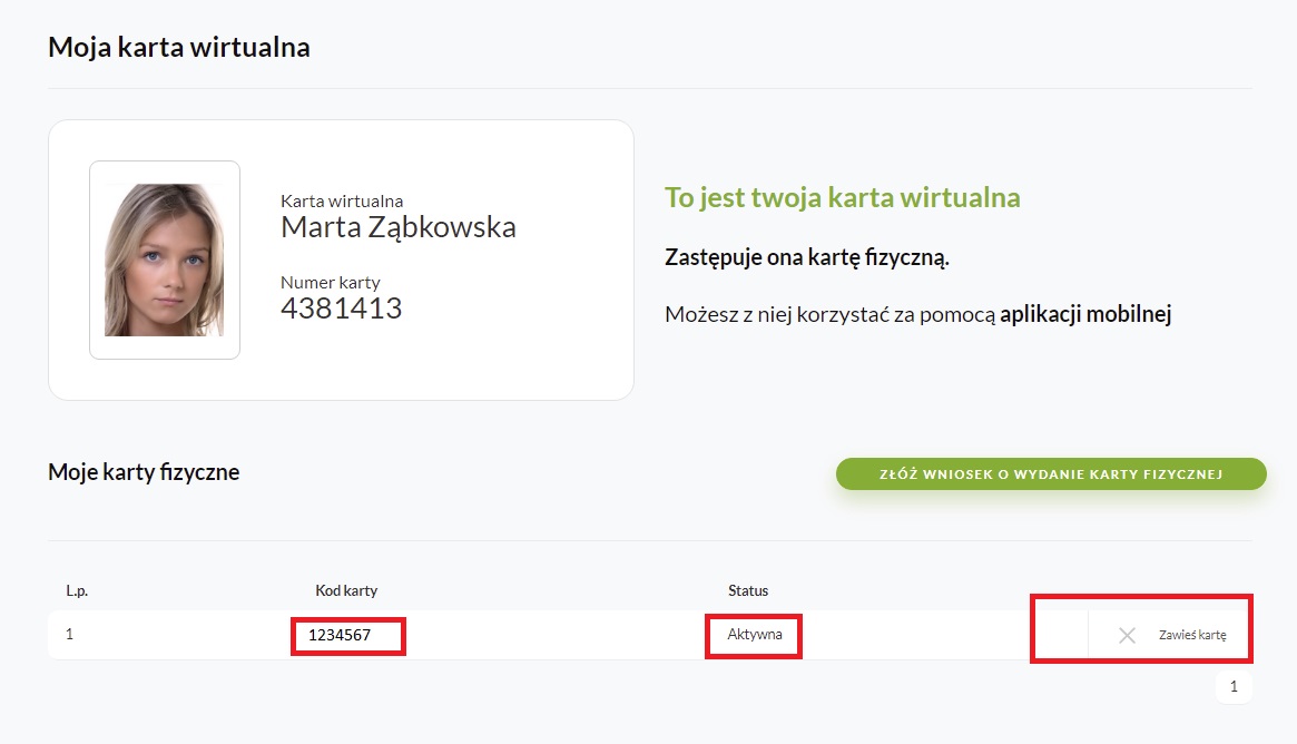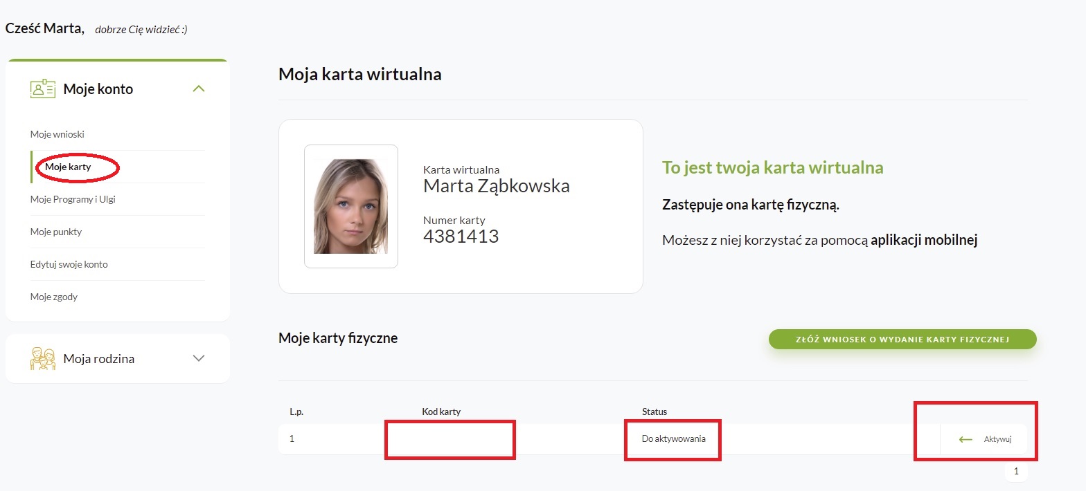 Po zalogowaniu w menu ?Moje Konto? w zakładce ?Moje Karty? widoczna jest karta wirtualna użytkownika oraz jest informacja o kartach fizycznych (posiadanych aktualnie i ew. wcześniejszych).