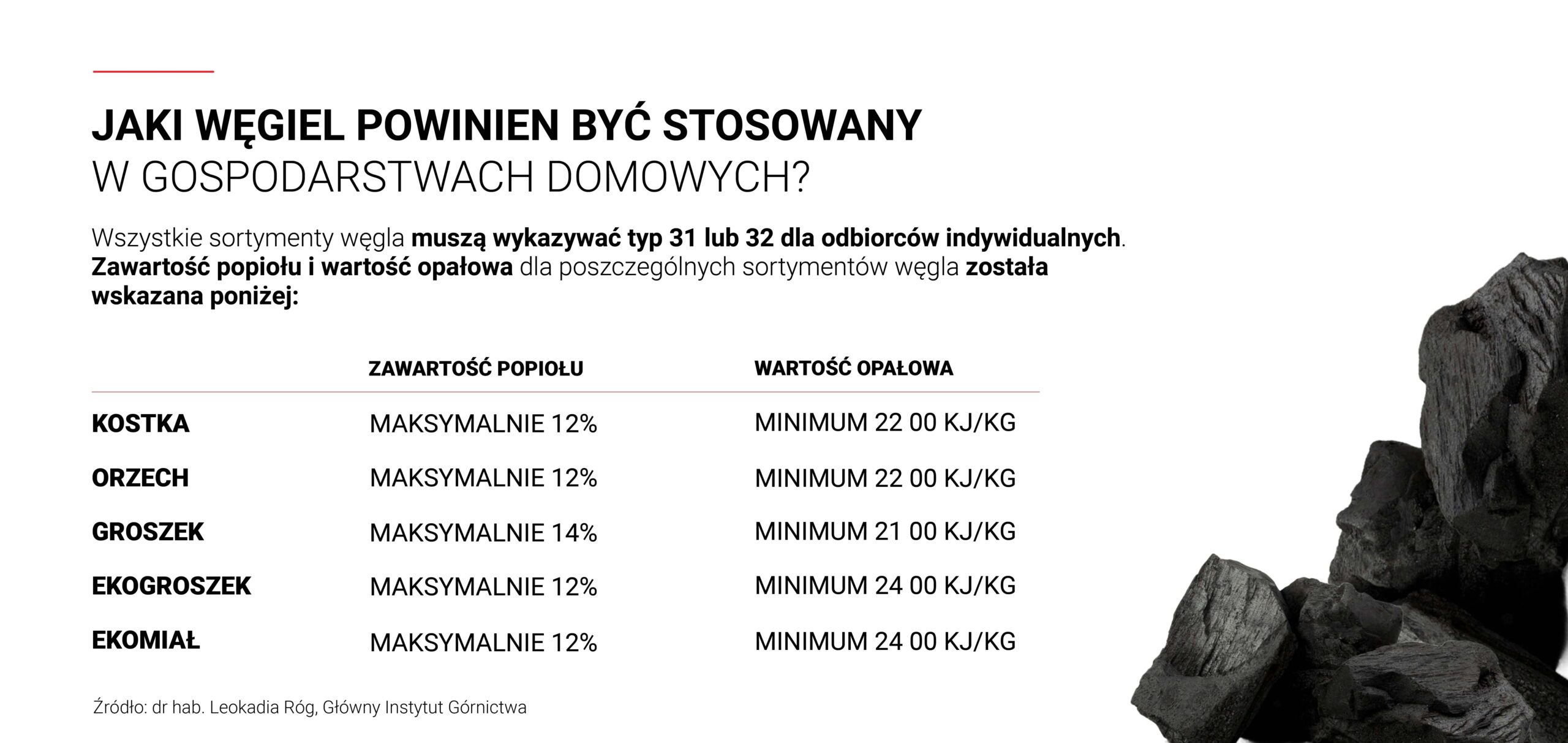 Oczywiście na wartość opałową węgla istotny wpływ ma zawartość wilgoci całkowitej i popiołu w węglu. Czym większa zawartość popiołu i wilgoci w węglu tym mniejsza jego wartość opałowa. Według rozporządzenia Kostka i Orzech powinny wykazywać zawartość popiołu maksymalnie 12% i wartość opałową nie mniejszą niż 22 000 kJ/kg. Groszek powinien mieć maksymalnie 14% popiołu i wartość opałową nie mniejszą niż 21 000 kJ/kg. Ekogroszek, czyli paliwo predystynowane do stosowania w kociołkach domowych powinno charakteryzować się zawartością popiołu maksymalnie 12% i wartością opałową nie mniejszą niż 24 000 kJ/kg. Jest jeszcze jeden sortyment, który może być stosowany w instalacjach poniżej 1 MW i w gospodarstwach domowych – ekomiał. Ekomiał, podobnie jak ekogroszek, powinien wykazywać zawartość popiołu maksymalnie 12% i wartość opałową nie mniejszą niż 24 000 kJ/kg, a zawartość ziaren o średnicy poniżej 3 mm nie powinna przekraczać w nim 15%.