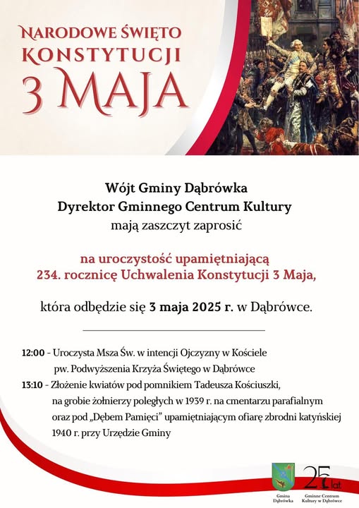Wójt Gminy Dąbrówka oraz Dyrektor Gminnego Centrum Kultury serdecznie zapraszają na uroczystość upamiętniającą 234. rocznicę Uchwalenia Konstytucji 3 Maja, która odbędzie się 3 maja 2025 r. w Dąbrówce.
