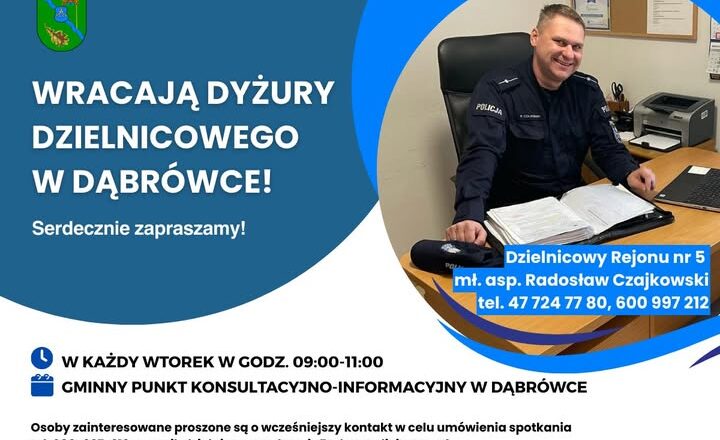 Dobra wiadomość dla mieszkańców Gminy Dąbrówka! Wróciły dyżury dzielnicowego! Masz pytania? Chcesz zgłosić sprawę? Skorzystaj z dyżuru dzielnicowego! Nie musisz już jechać do Komisariatu Policji w Radzyminie – teraz można spotkać się z dzielnicowym na miejscu, po wcześniejszym kontakcie telefonicznym.