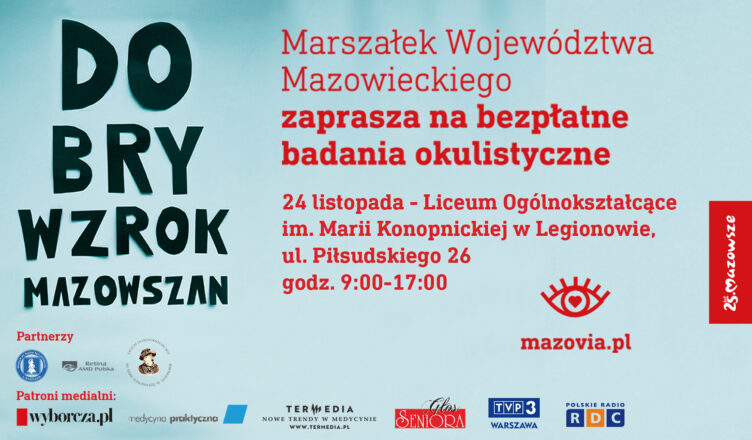 Samorząd województwa mazowieckiego zaprasza dorosłych mieszkańców powiatu legionowskiego na darmowe przesiewowe badania wzroku. Aby wziąć w nich udział, nie jest potrzebne skierowanie od lekarza. Wystarczy przyjść w niedzielę, 24 listopada do Liceum Ogólnokształcącego im. M. Konopnickiej w Legionowie.