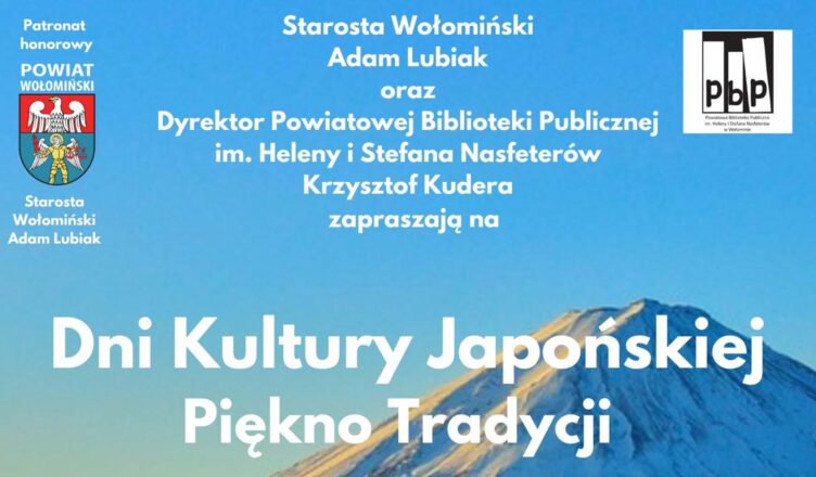 Powiatowa Biblioteka Publiczna w Wołominie zaprasza na wydarzenia w w dniach 30 listopada, 6 grudnia, 18 grudnia, w ramach DNI KULTURY JAPOŃSKIEJ – PIĘKNO TRADYCJI oraz do objęcia patronatem medialnym tych wydarzeń.