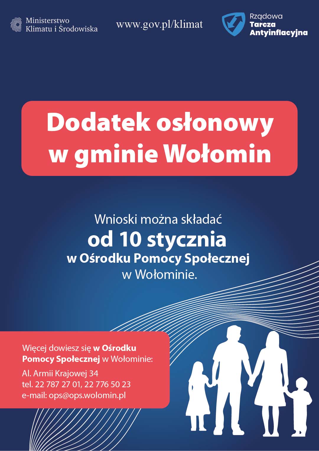 Ponownie można ubiegać się o wypłatę dodatku osłonowego. Dla mieszkańców gminy Wołomin zadanie to będzie realizowane przez Ośrodek Pomocy Społecznej w Wołominie.