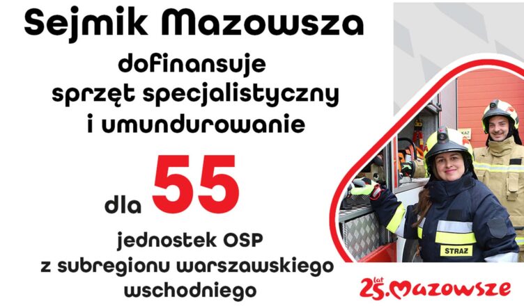 Ponad 4,4 mln zł z budżetu województwa mazowieckiego trafi do 439 jednostek ochotniczych straży pożarnych z Mazowsza. Decyzją radnych województwa mazowieckiego pieniądze zostaną przeznaczone na zakup specjalistycznego sprzętu, umundurowania, a także środków ochrony osobistej. To kolejne w tym roku wsparcie dla OSP z Mazowsza. Z pomocy finansowej skorzysta 55 jednostek OSP z subregionu warszawskiego wschodniego.
