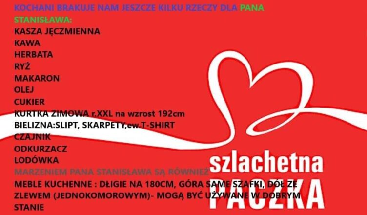 Najważniejszymi potrzebami Pana Stanisława są węgiel na zimę, prodiż i obuwie (rozmiar 45). Marzeniem są również meble kuchenne: 180 cm długie, góra same szafki; dół ze zlewem (jednokomorowym) – mogą być używane w dobrym stanie.