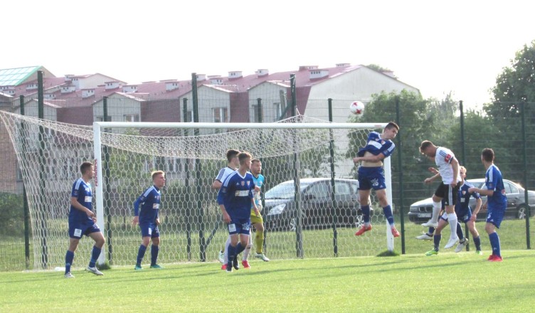 W trakcie pierwszej połowy spotkania zarówno grze, jak i obserwacji meczu zdecydowanie nie sprzyjały warunki atmosferyczne, gdyż nad siedleckim obiektem rozszalał się prawdziwy huragan. Porywisty wiatr przestawiał namioty, a ulewny deszcz błyskawicznie ?zapewnił? zerową frekwencję dla mającego trwać do godziny 18.00 festiwalu ?Z ułańską fantazją?, organizowanego z okazji Dnia Dziecka. Wcześniejszy pokaz ułańskiej sprawności w wykonaniu Szwadronu Kawalerii im. 10 Pułku Ułanów Litewskich z Białegostoku, z dużym zainteresowanie obserwowało kilkaset osób. Dodatkowo bardzo ciekawym doznaniem, oprócz oczywiście prób skupienia się bieżącej obserwacji meczu, w towarzystwie dosłownie kilku osób, było zerkanie ?kątem oka? na dwie sporych rozmiarów kule zorbing, które wcześniej stanowiły główną atrakcję dla najmłodszych, a umieszczone zostały na sąsiednim boisku treningowym. Tempo w jakim przemieszczały je podmuchy wiatru zdecydowanie przekraczało możliwości jakiegokolwiek użytkownika, chyba żeby toczył się z górki. Zapewne właśnie mokrym boiskiem i trudnymi warunkami należy tłumaczyć niefortunną interwencję Michała Markiewicza z 18 minuty spotkania, który po dośrodkowaniu Konrada Cichowskiego z lewej strony boiska tak dokładnie starał się zgrywać piłkę do swojego bramkarza, że? ostatecznie go przelogował. Kwadrans później, gdy niebo już nieco przejaśniało w dogodnej sytuacji do zdobycia gola znalazł się Cichowski, który po prostopadłym podaniu Daniela Nawrockiego znalazł się sam na wprost bramkarza gospodarzy, ale po minięciu go, zabrakło mu miejsca na oddanie skutecznego strzału.
