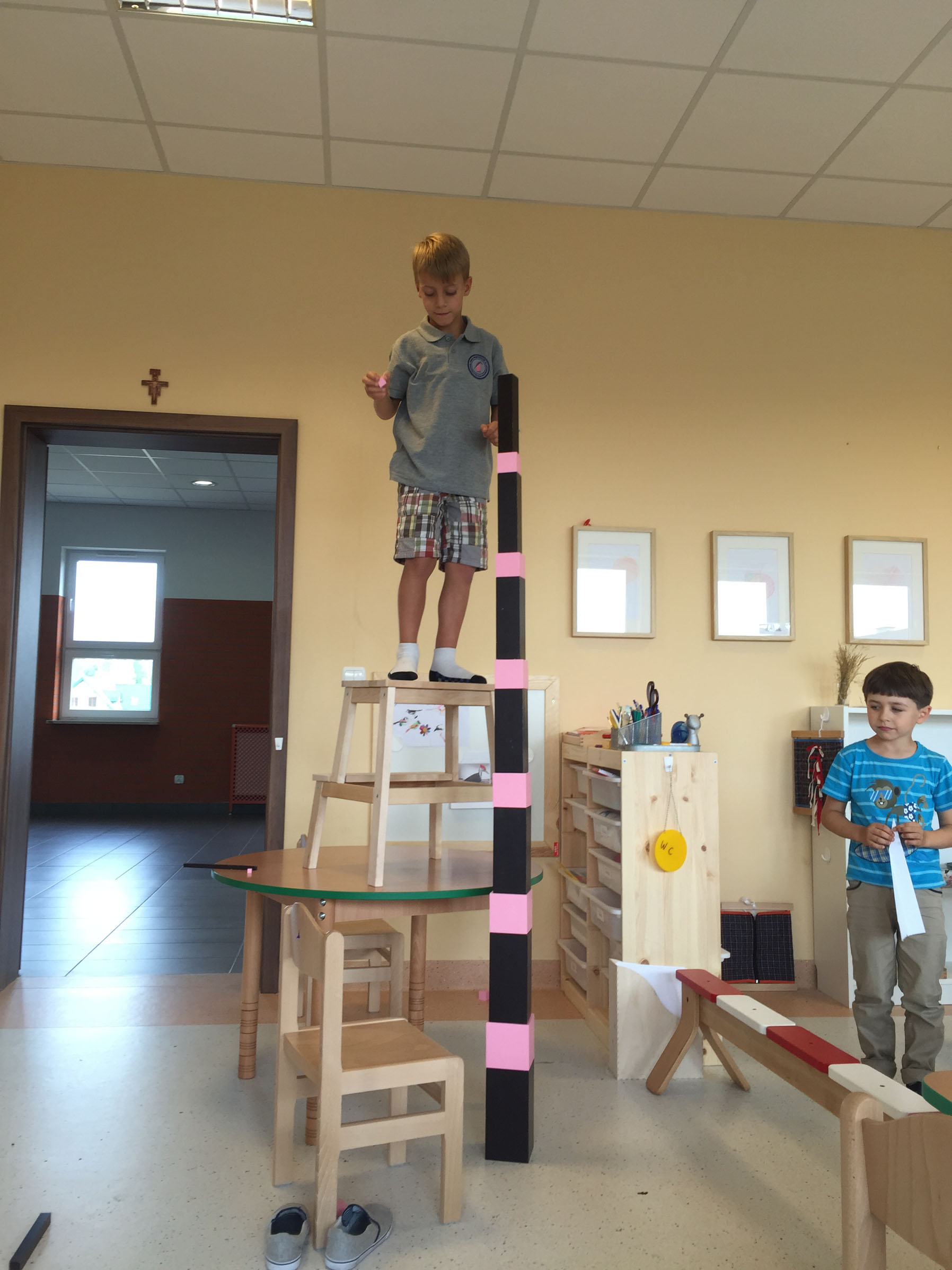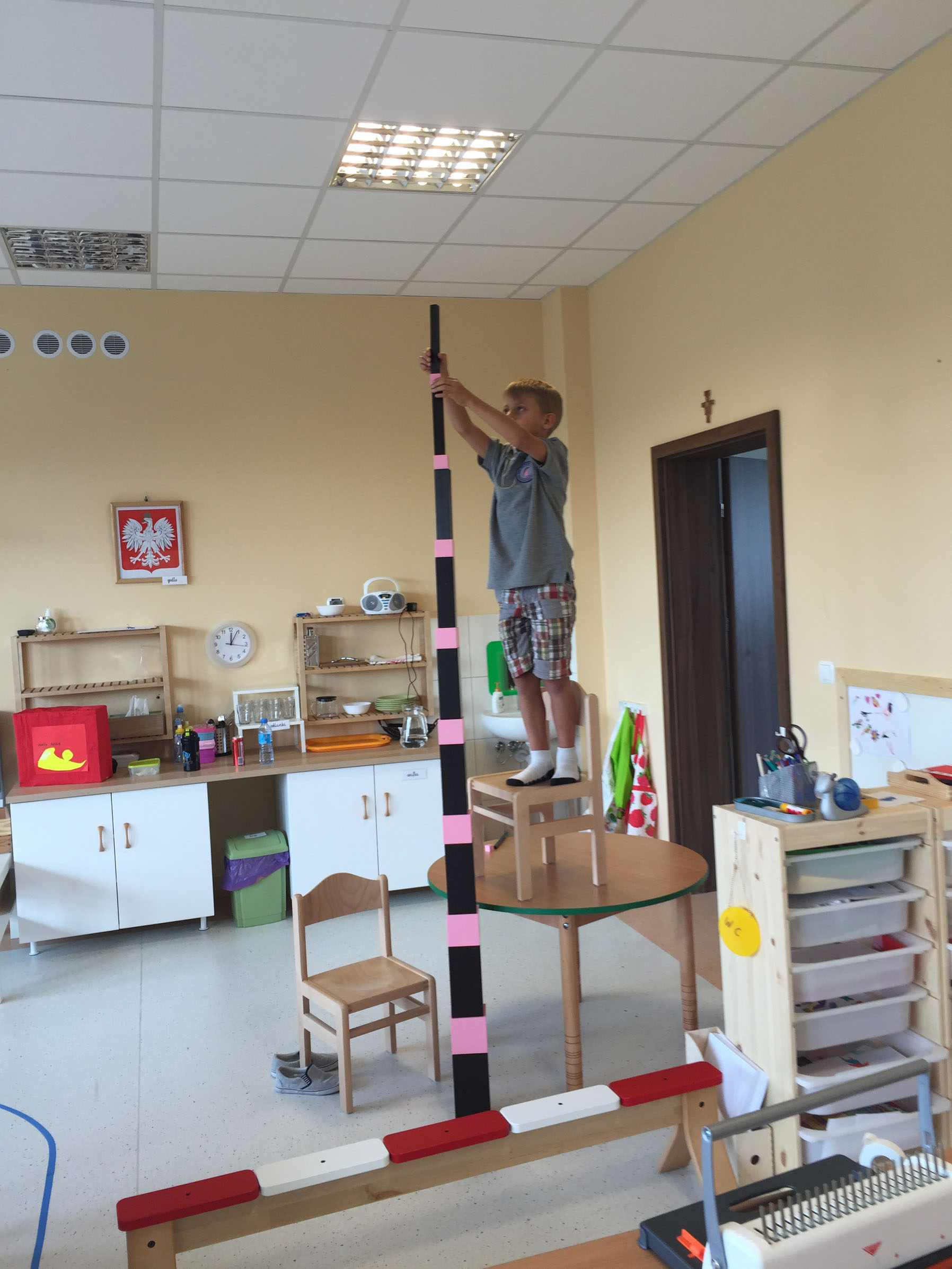 W USA przebadano dzieci z tzw. normalnych klas. Okazało się, że mają one ogromne problemy w utrzymaniu właściwej postury ciała i w utrzymaniu właściwego napięcia mięśniowego. W porównaniu z dziećmi badanymi w latach 1980-tych, tylko jedno dziecko spośród 12-tu miało odpowiednią dla swojego wieku siłę i równowagę. Większość dzieci ma niedorozwinięty system równowagi spowodowany niedostateczną ilością ruchu. Aby wypracować sobie mocny system równowagi, czyli wzmocnić układ przedsionkowy, ciało dziecka musi poruszać się we wszystkich kierunkach, na różne sposoby, i to godzinami. Nie wystarczą zajęcia np. z piłki nożnej dwa razy w tygodniu. Dzieci instynktownie starają się zaspokoić w sobie tę potrzebę. Stąd, gdy im tylko na to pozwolimy i stworzymy odpowiednie warunki, będą biegać, kręcić się, podskakiwać, wymachiwać ramionami, kopać, itd. Za wszelką cenę, same dążą do wzmocnienia układu przedsionkowego. Obserwuję to na każdej przerwie, patrząc, jak dzieci ?szaleją? z dużymi, miękkimi klockami. W szkołach Montessori dzieci nie muszą siedzieć przy stolikach. Najczęściej pracują na dywanikach, na podłodze, przybierając różne postawy ciała. Mogą poruszać się po klasie.